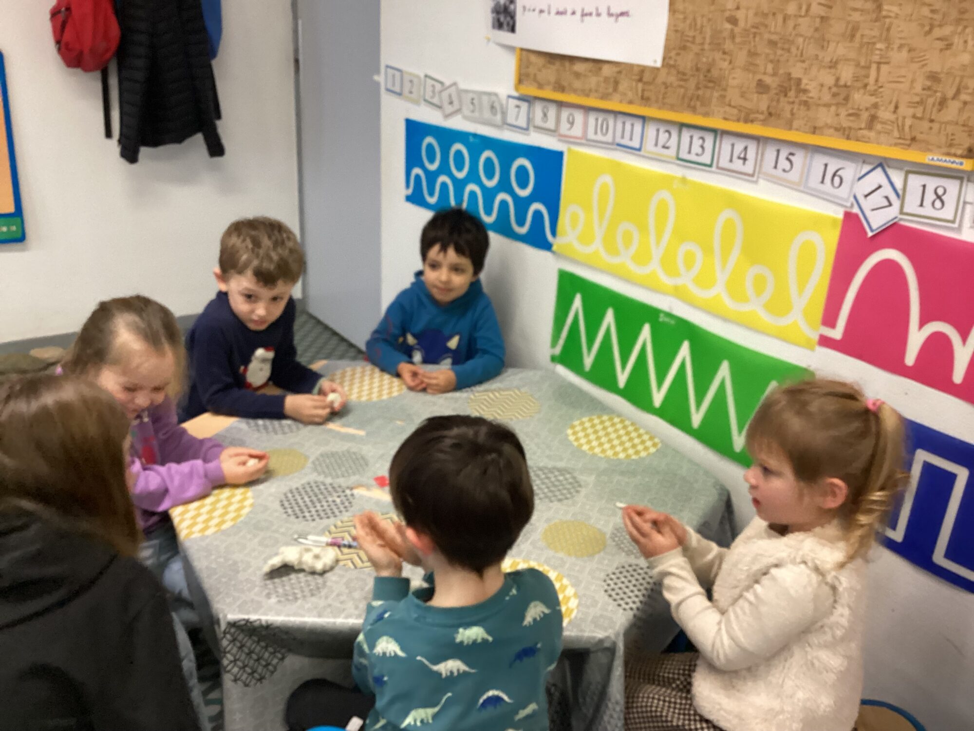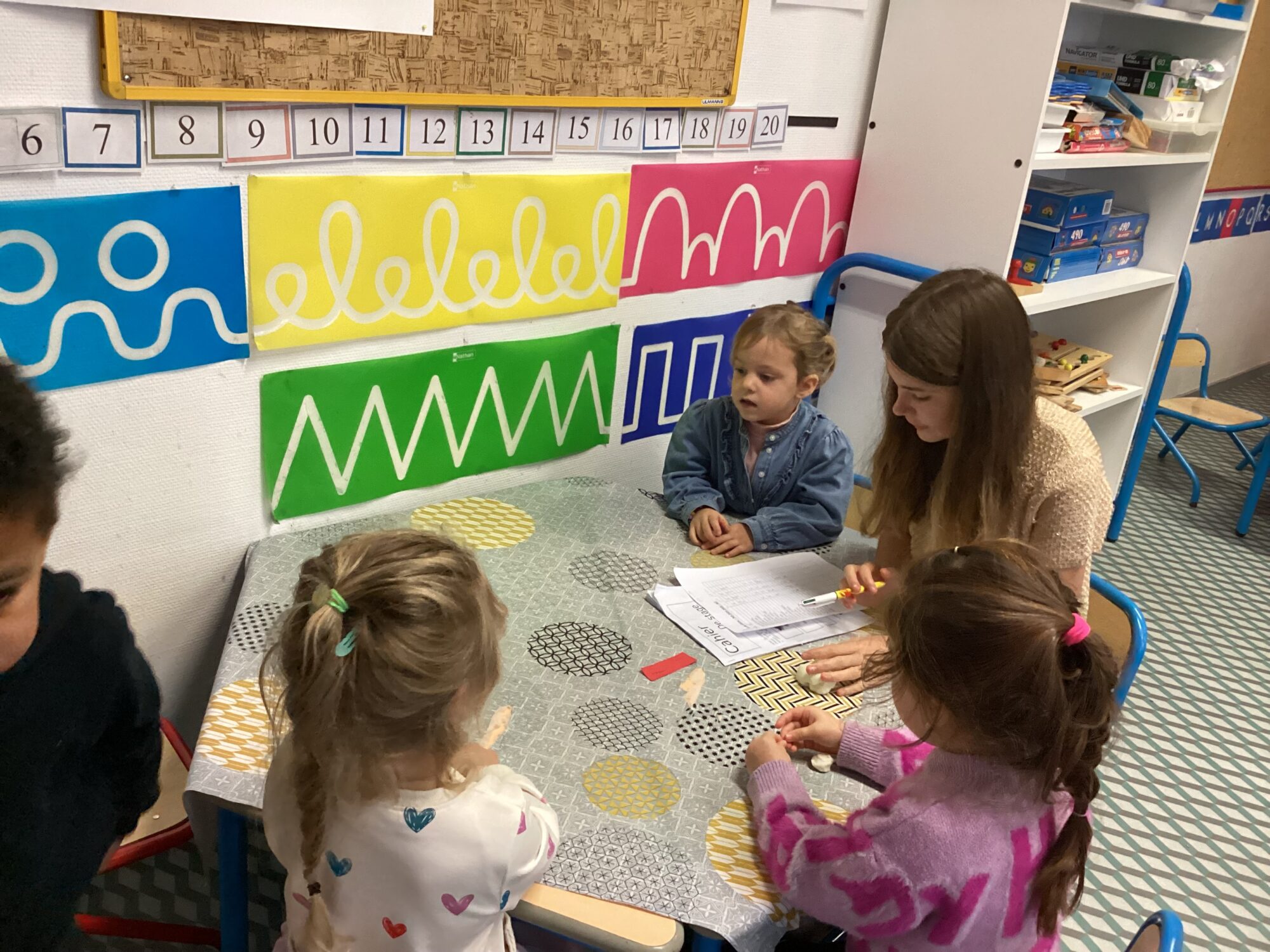 Avec Louna, en stage dans la classe, les enfants utilisent la pâte à modeler afin de créer différents éléments.