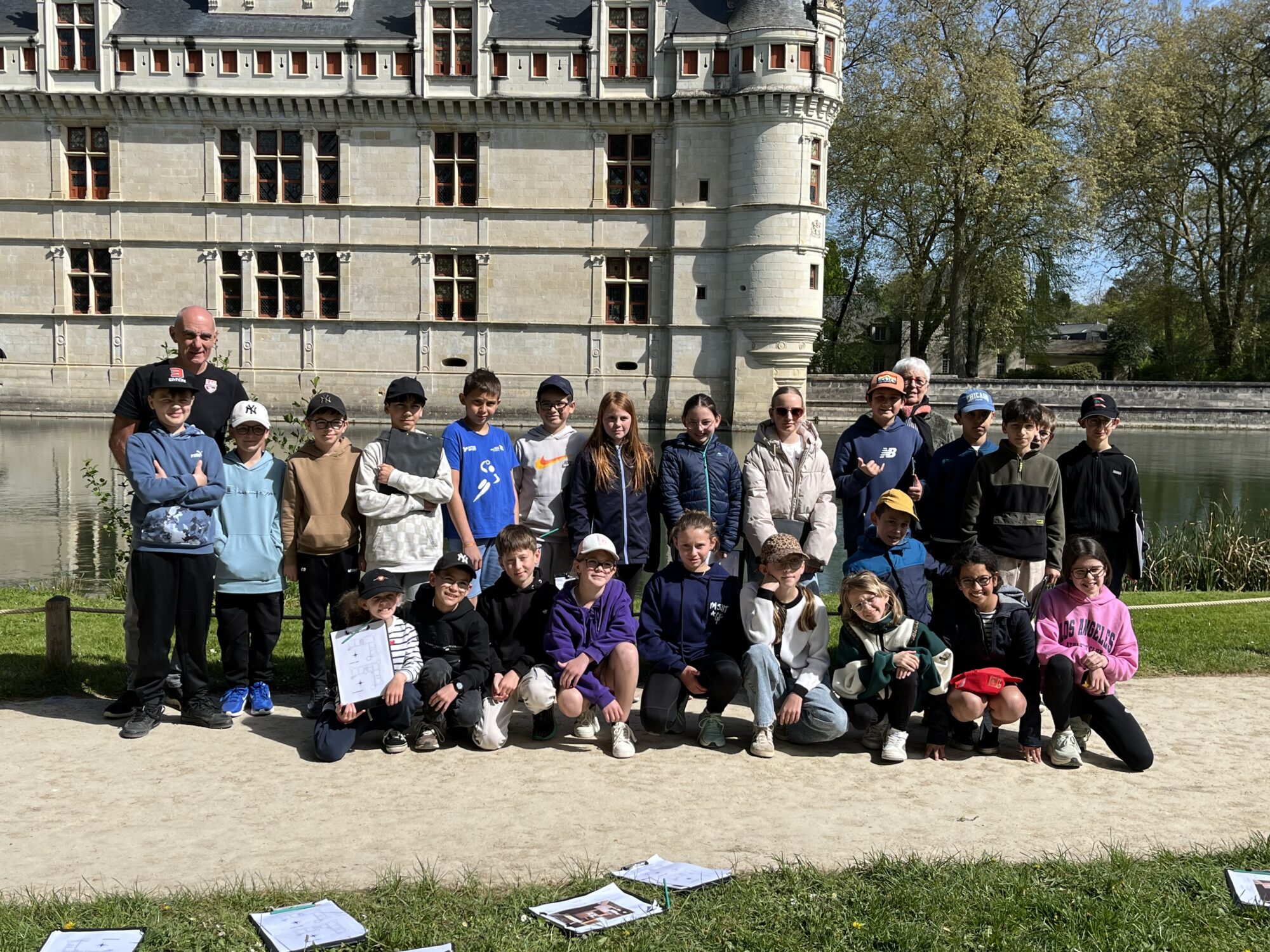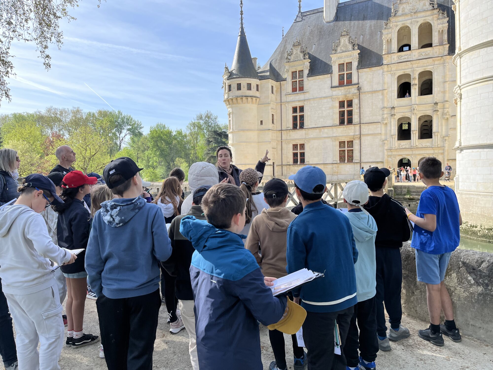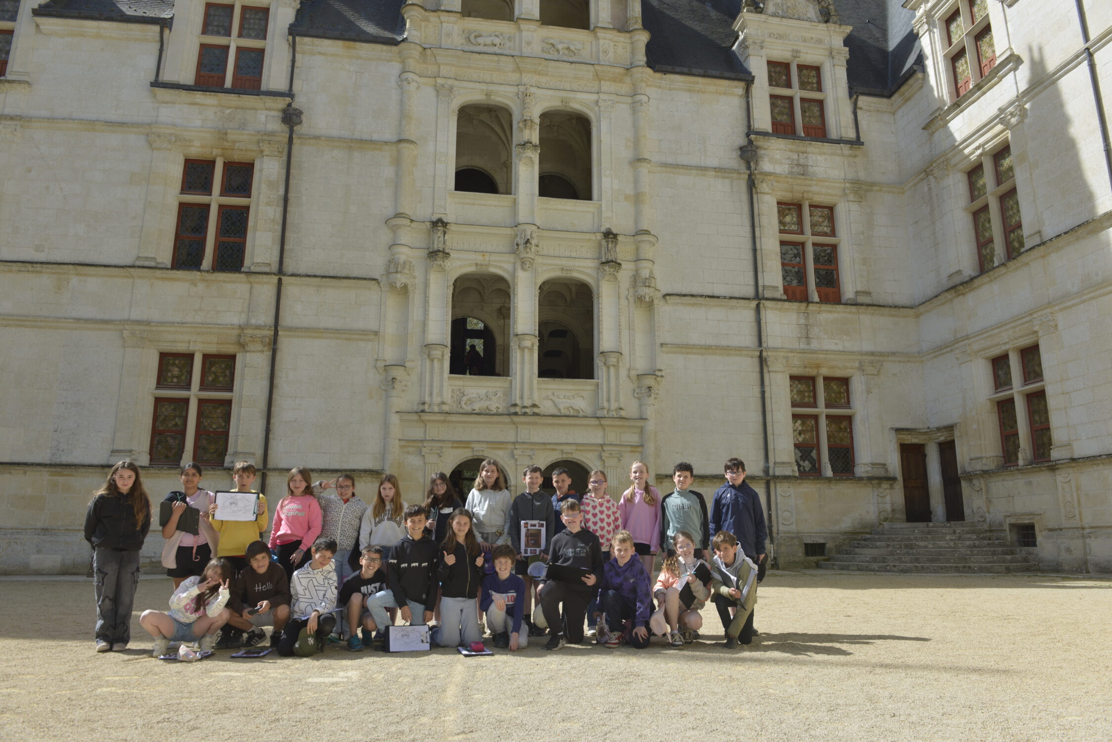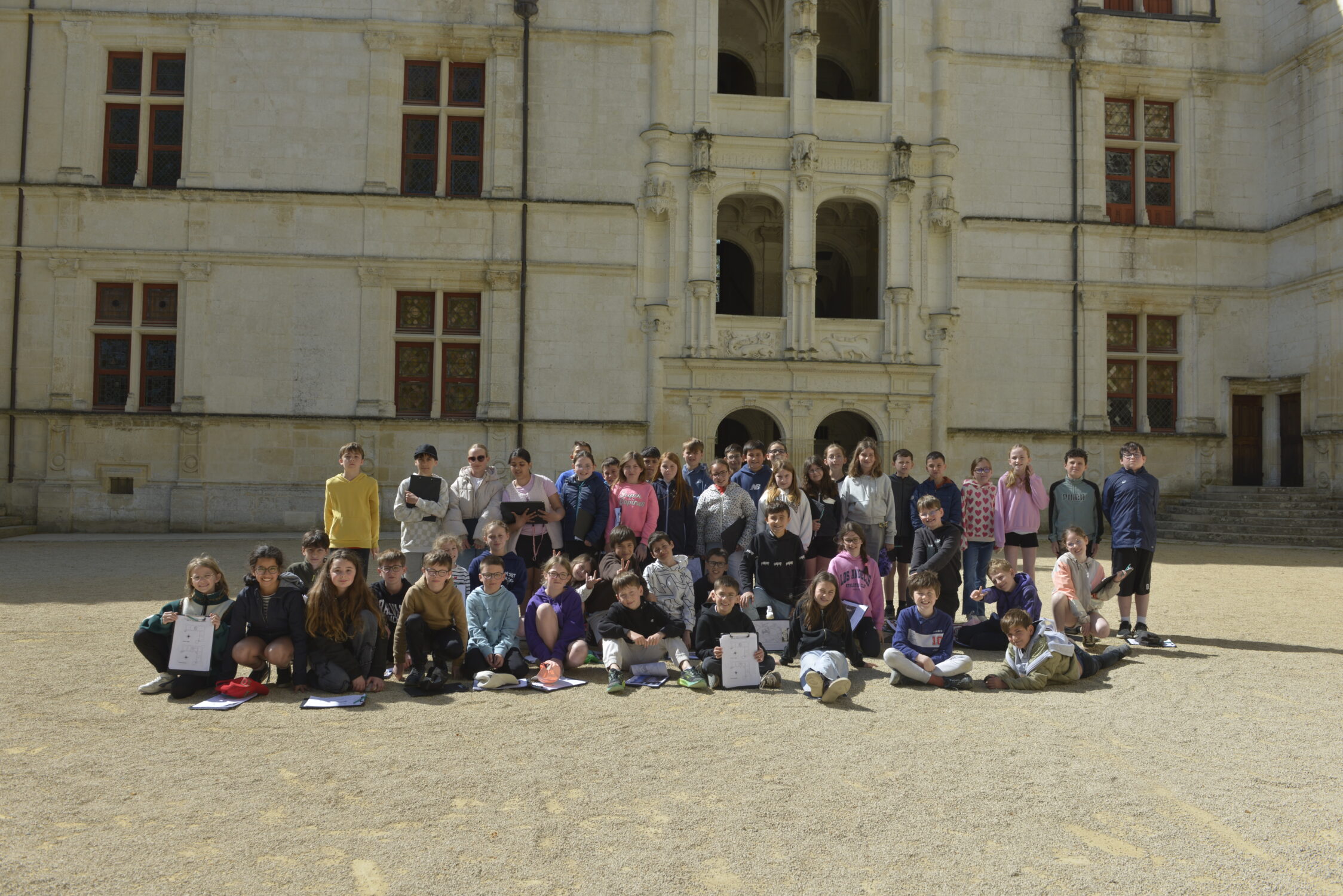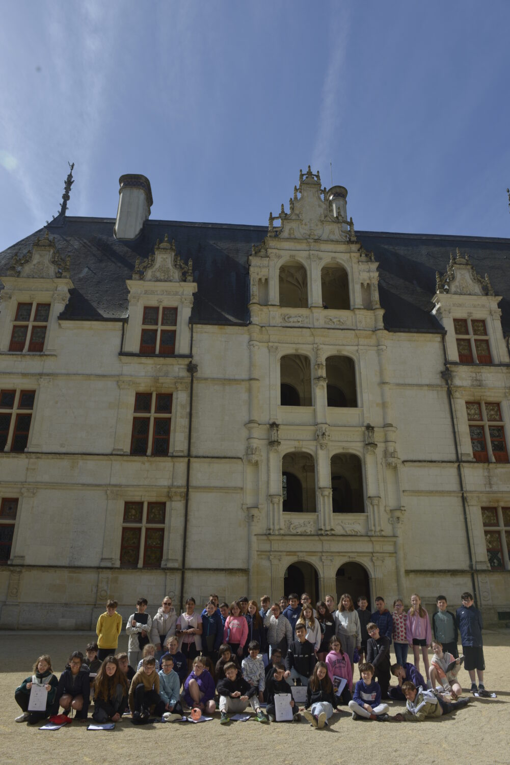 Nous voilà partis pour Azay le Rideau. Une visite du château était programmée. Ce monument est un joyau de la Renaissance française. Il semble flotter sur les eaux de l’Indre qui l’entourent. Construit au XVIe siècle sous le règne de François Ier, il présente une architecture raffinée alliant l’élégance italienne et la tradition française de l’époque. Nous avons pu suivre les explications de notre guide qui nous a transmis ses connaissances à travers la découverte du vocabulaire de l’architecture (tourelle, corniche, encorbellement, pilastre …). Le travail d’observation de la façade arrière nous a même permis de faire des liens avec les cours de géométrie sur la symétrie. Avec la visite de l’intérieur nous avons découvert une partie des appartements de l’ancien propriétaire, Gilles Berthelot, un riche financier et maire de Tours, au début du XVIe siècle. Aujourd’hui, il appartient à tous les Français et est géré par le Centre des monuments nationaux.