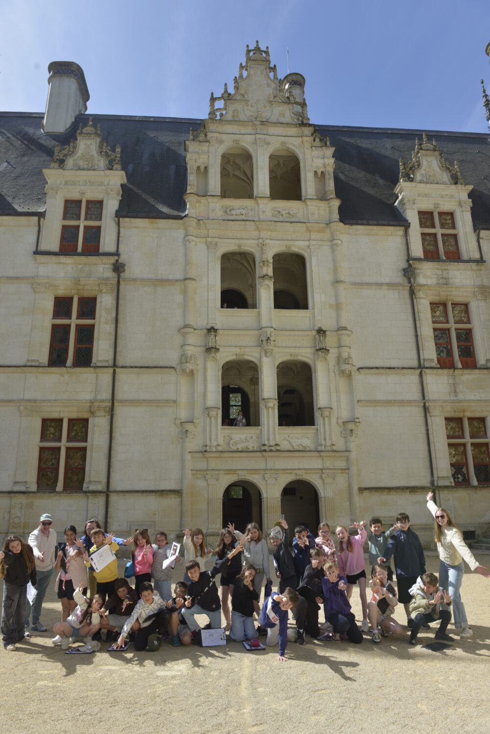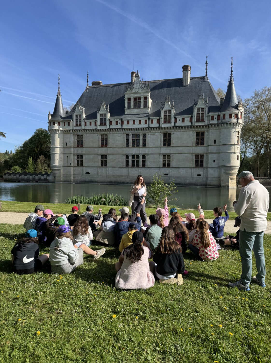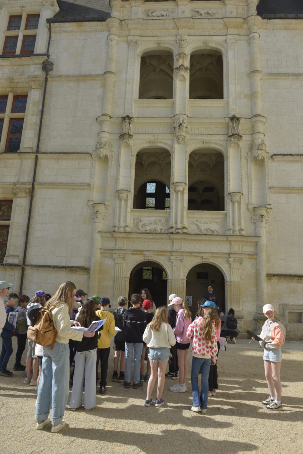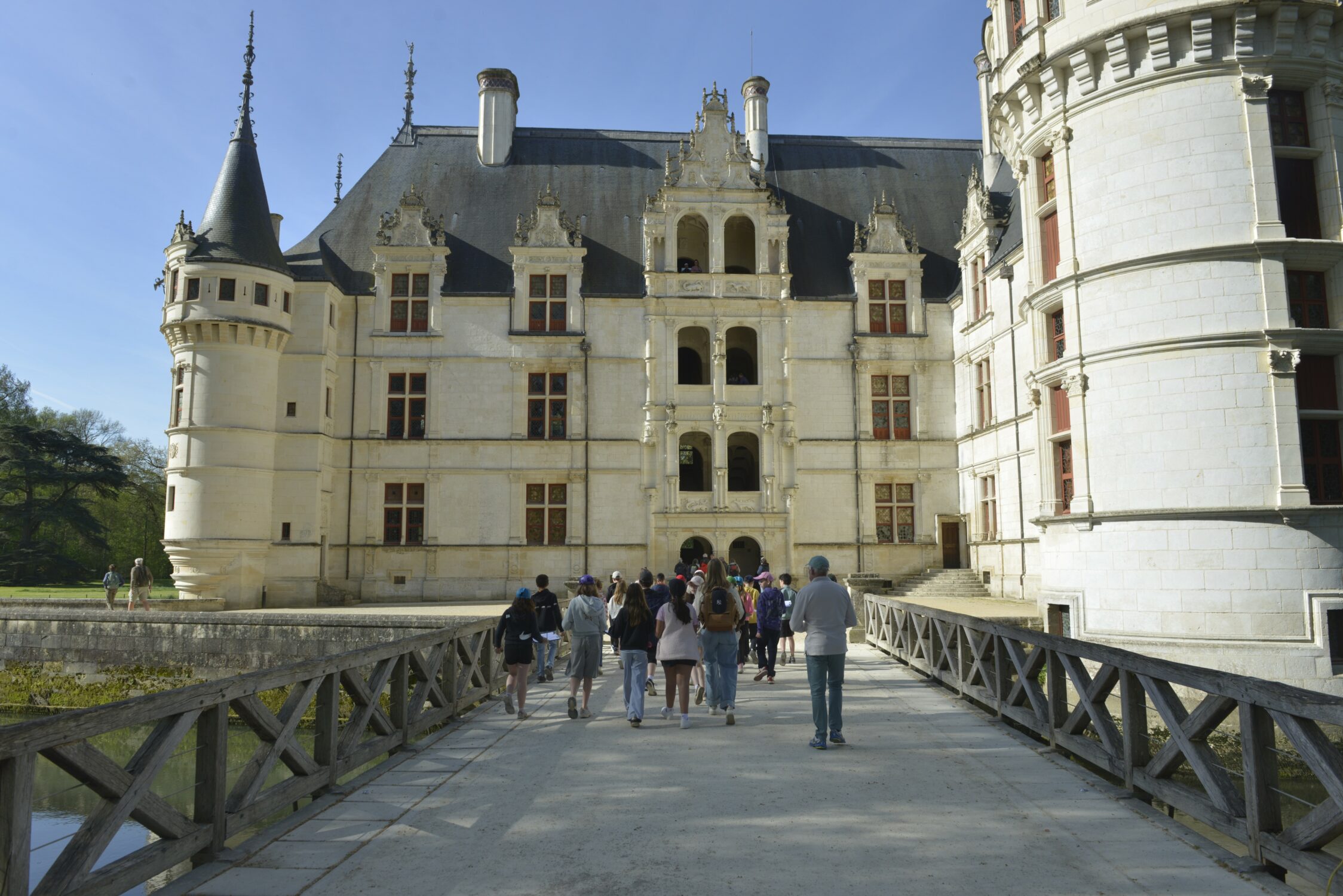 Nous voilà partis pour Azay le Rideau. Une visite du château était programmée. Ce monument est un joyau de la Renaissance française. Il semble flotter sur les eaux de l’Indre qui l’entourent. Construit au XVIe siècle sous le règne de François Ier, il présente une architecture raffinée alliant l’élégance italienne et la tradition française de l’époque. Nous avons pu suivre les explications de notre guide qui nous a transmis ses connaissances à travers la découverte du vocabulaire de l’architecture (tourelle, corniche, encorbellement, pilastre …). Le travail d’observation de la façade arrière nous a même permis de faire des liens avec les cours de géométrie sur la symétrie. Avec la visite de l’intérieur nous avons découvert une partie des appartements de l’ancien propriétaire, Gilles Berthelot, un riche financier et maire de Tours, au début du XVIe siècle. Aujourd’hui, il appartient à tous les Français et est géré par le Centre des monuments nationaux.
