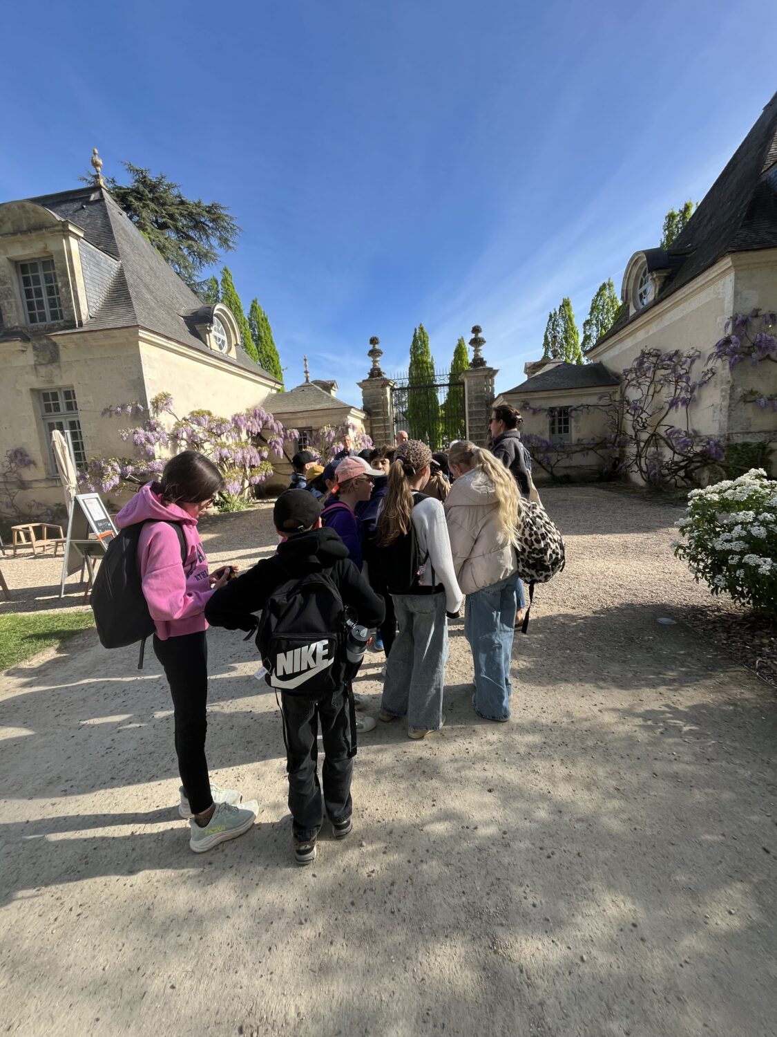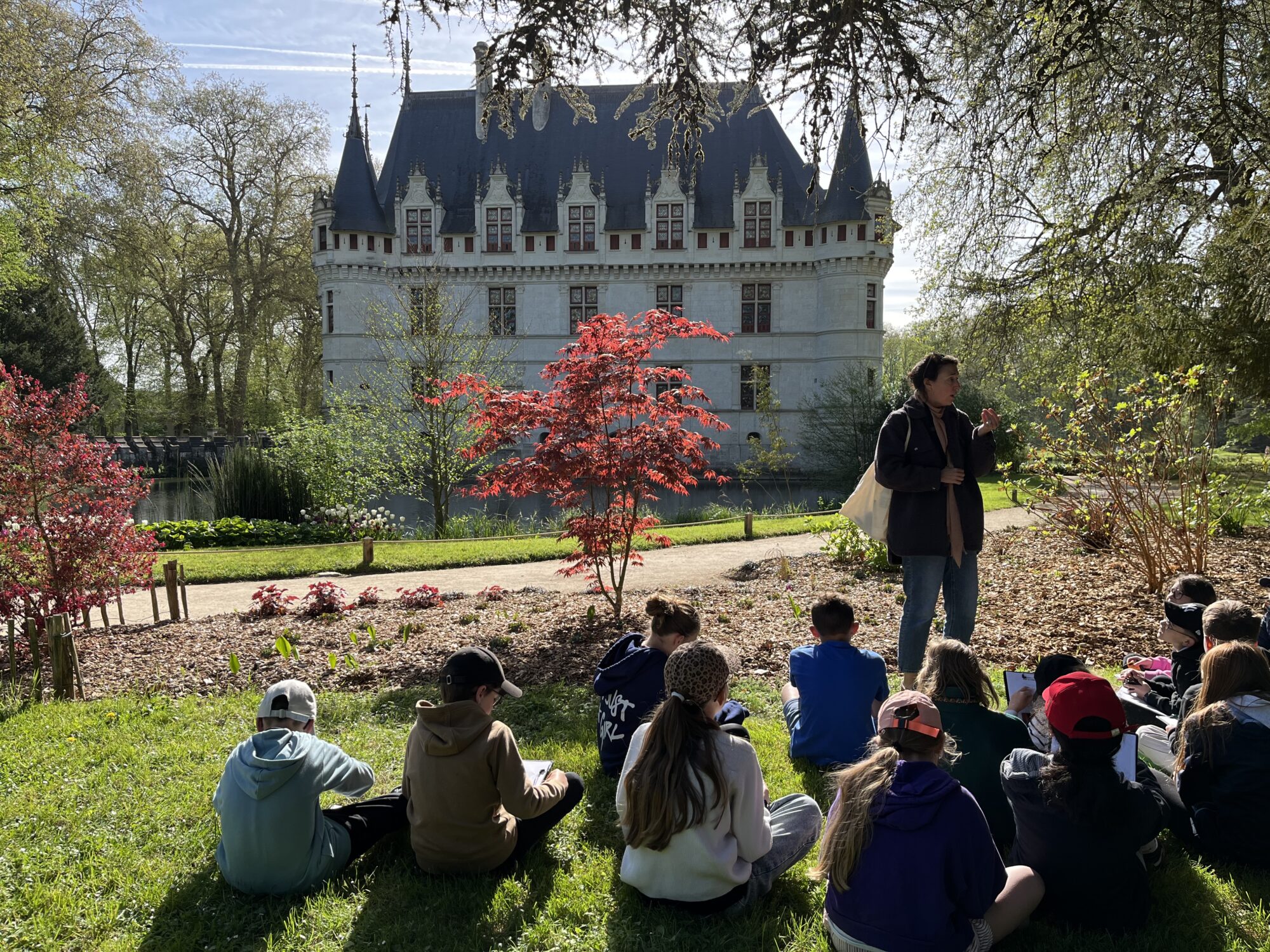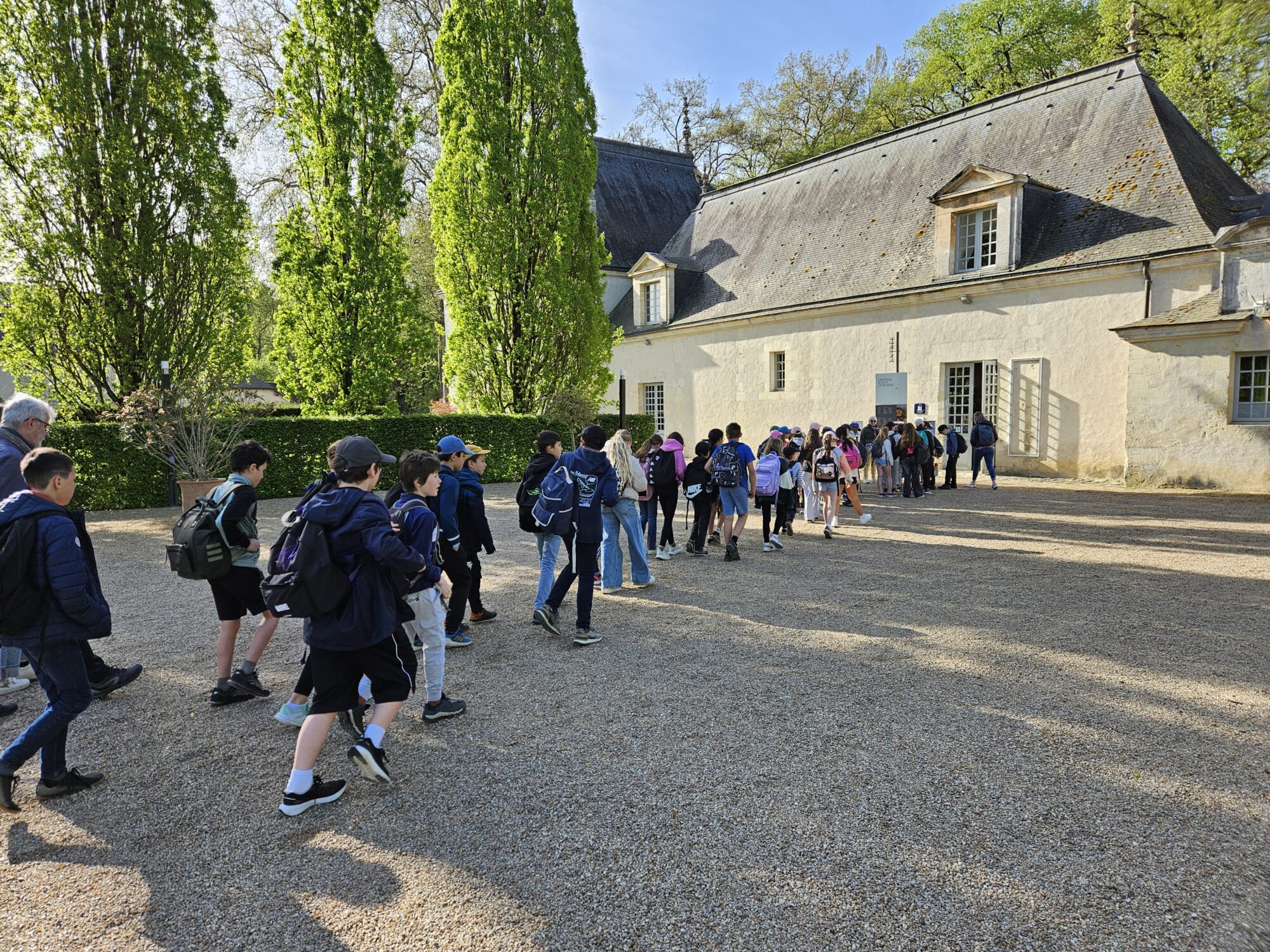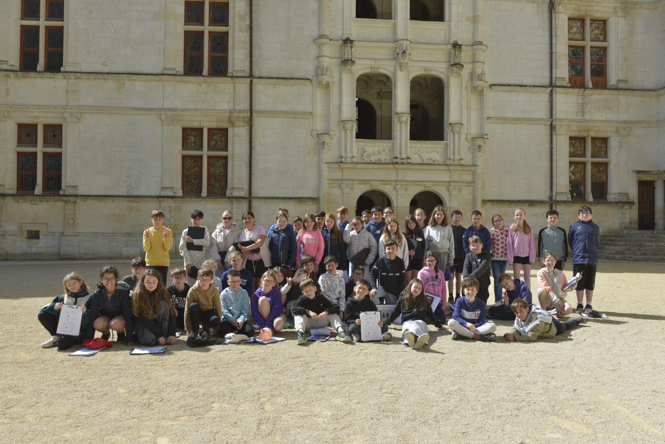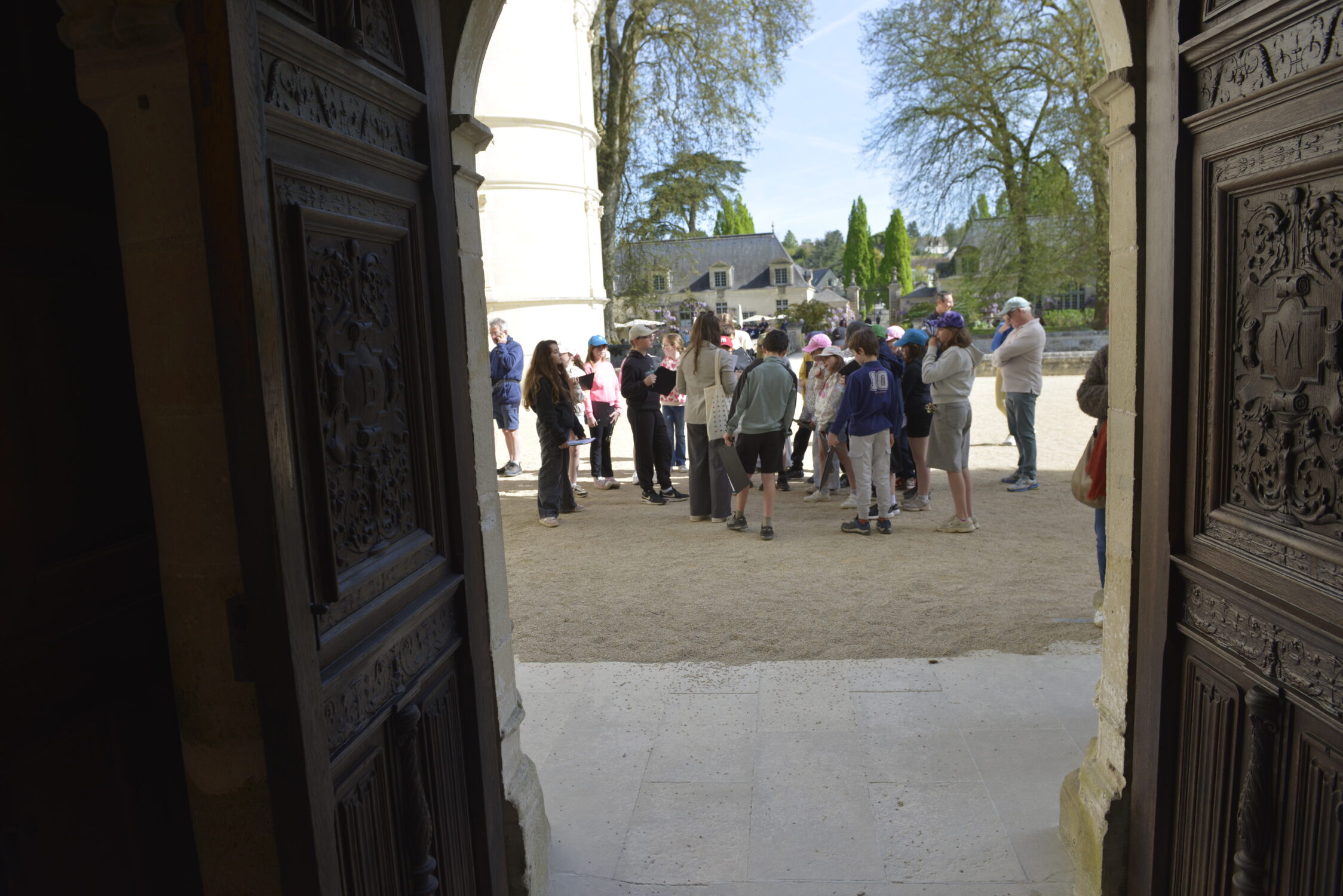 Nous voilà partis pour Azay le Rideau. Une visite du château était programmée. Ce monument est un joyau de la Renaissance française. Il semble flotter sur les eaux de l’Indre qui l’entourent. Construit au XVIe siècle sous le règne de François Ier, il présente une architecture raffinée alliant l’élégance italienne et la tradition française de l’époque. Nous avons pu suivre les explications de notre guide qui nous a transmis ses connaissances à travers la découverte du vocabulaire de l’architecture (tourelle, corniche, encorbellement, pilastre …). Le travail d’observation de la façade arrière nous a même permis de faire des liens avec les cours de géométrie sur la symétrie. Avec la visite de l’intérieur nous avons découvert une partie des appartements de l’ancien propriétaire, Gilles Berthelot, un riche financier et maire de Tours, au début du XVIe siècle. Aujourd’hui, il appartient à tous les Français et est géré par le Centre des monuments nationaux.