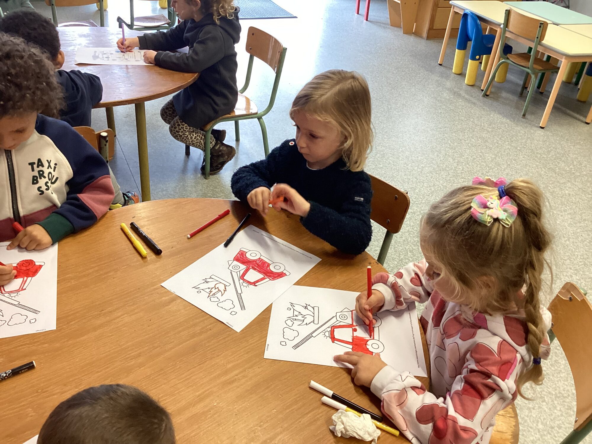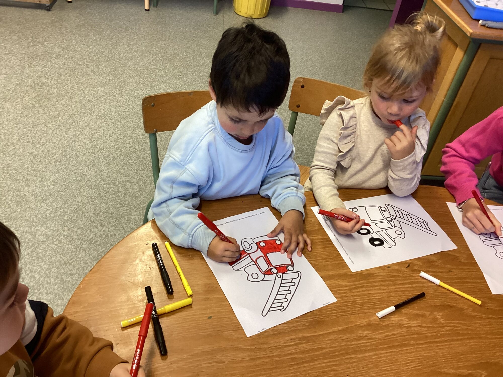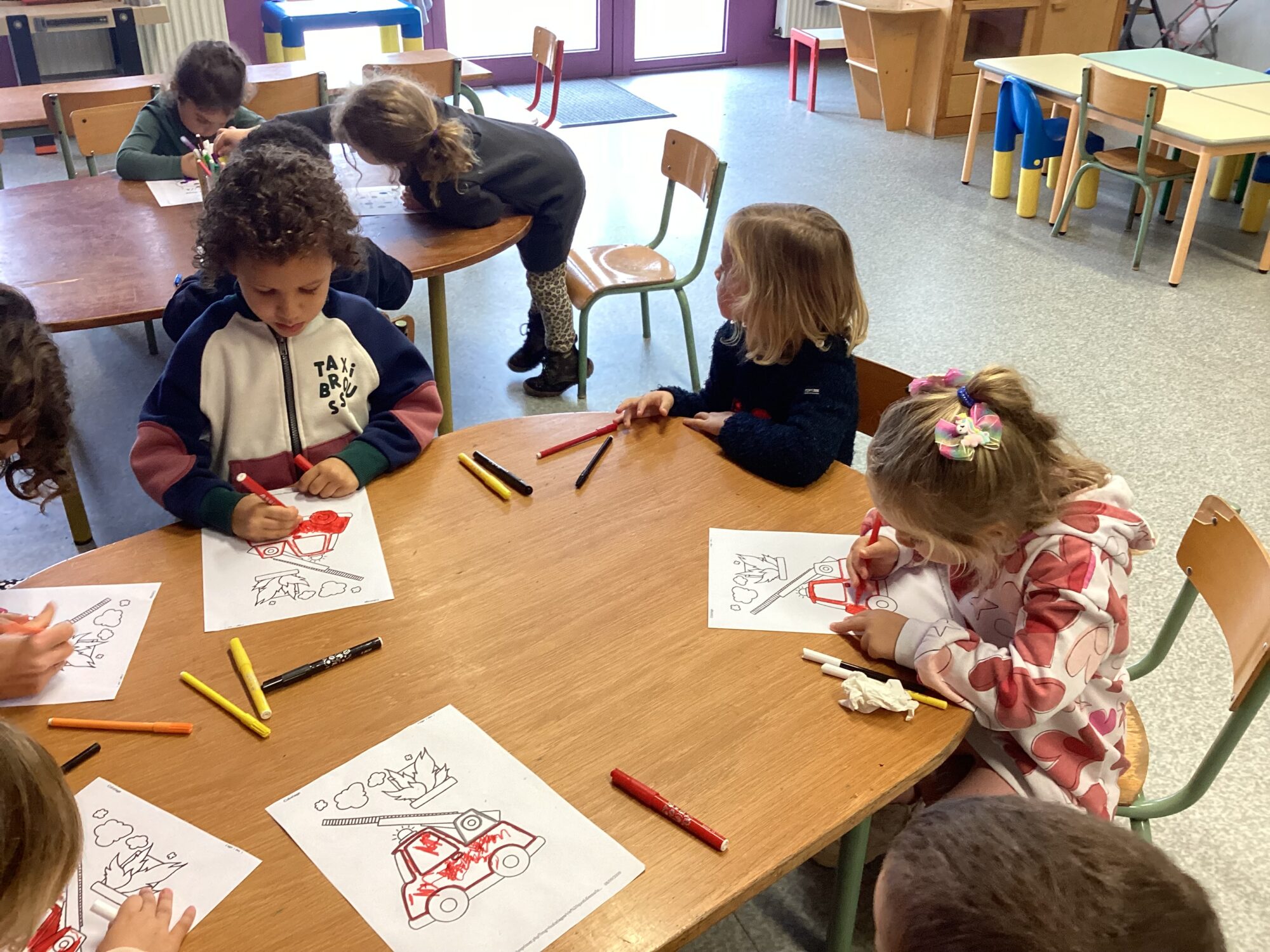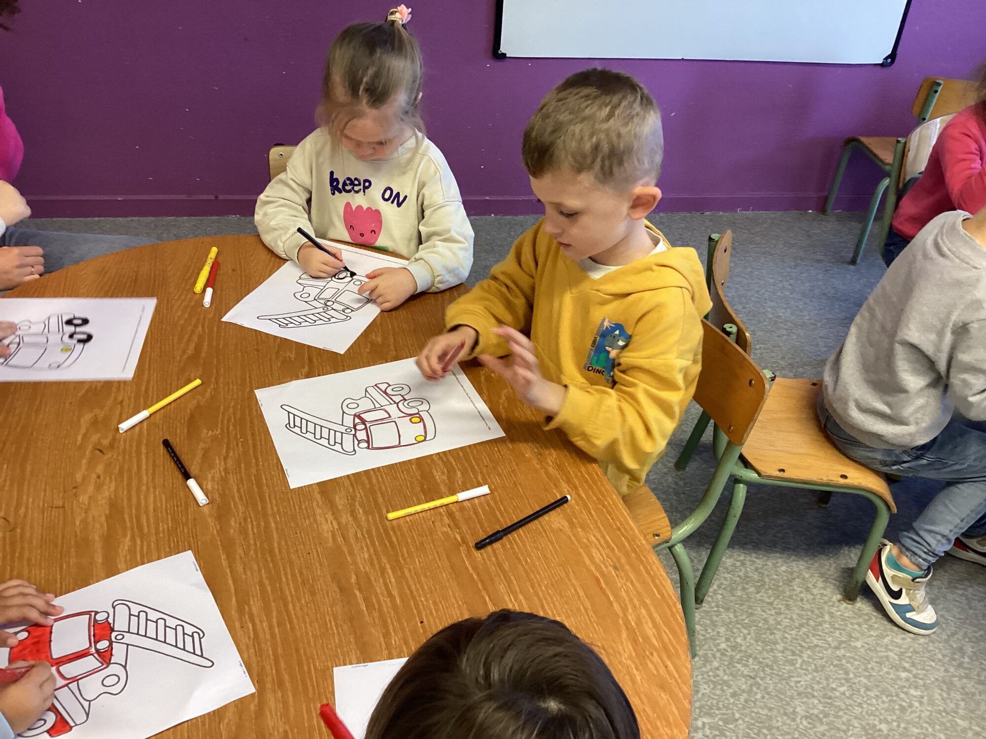 Les élèves réalisent chacun un coloriage de camion de pompiers, en atelier dirigé.