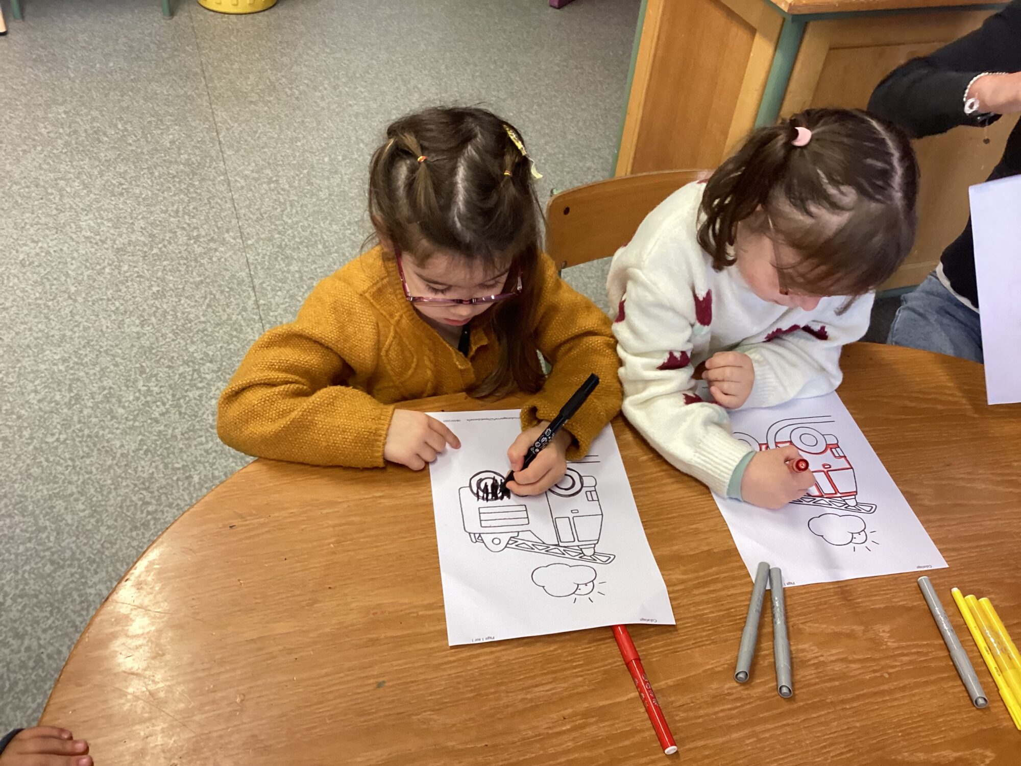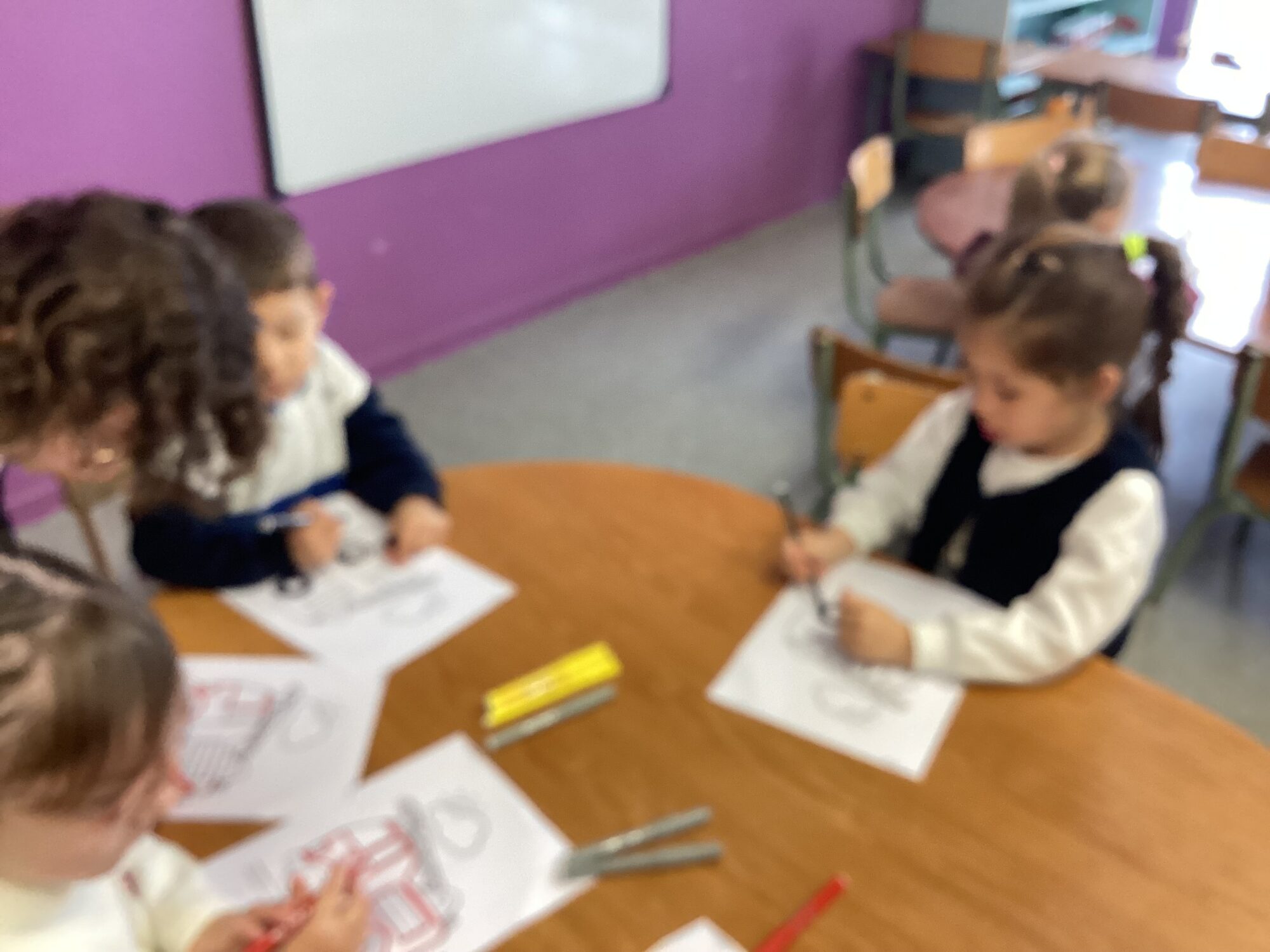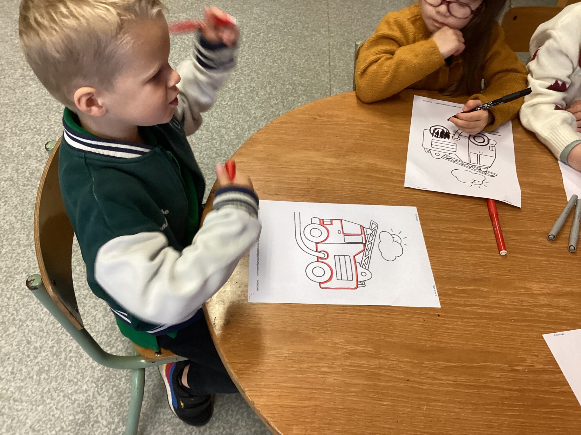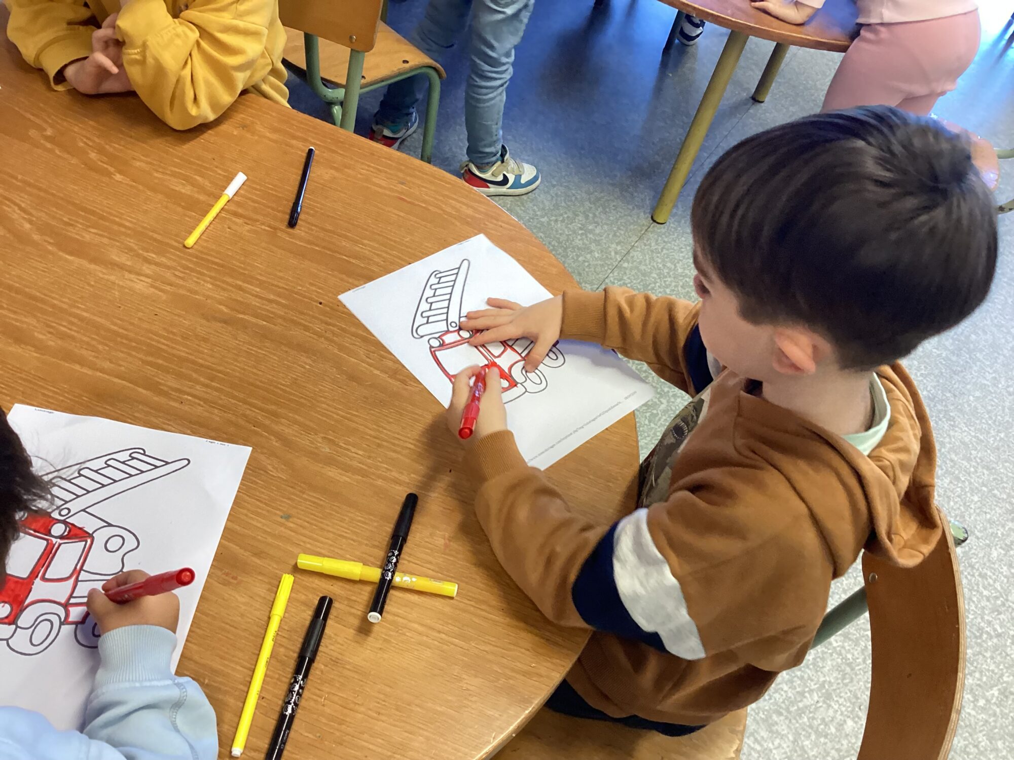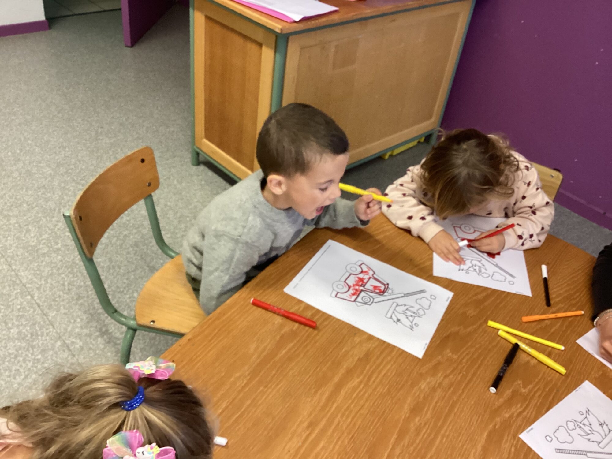 Les élèves réalisent chacun un coloriage de camion de pompiers, en atelier dirigé.