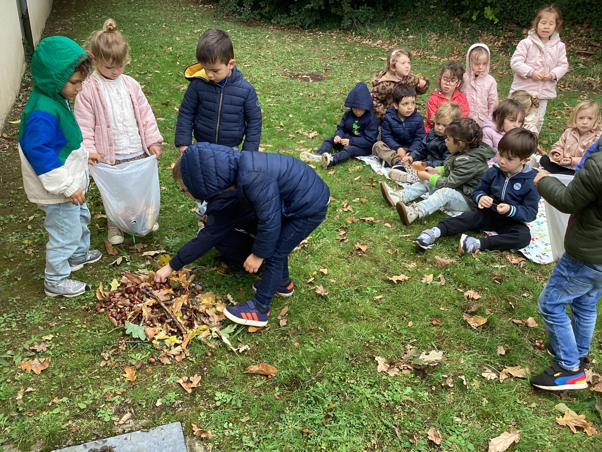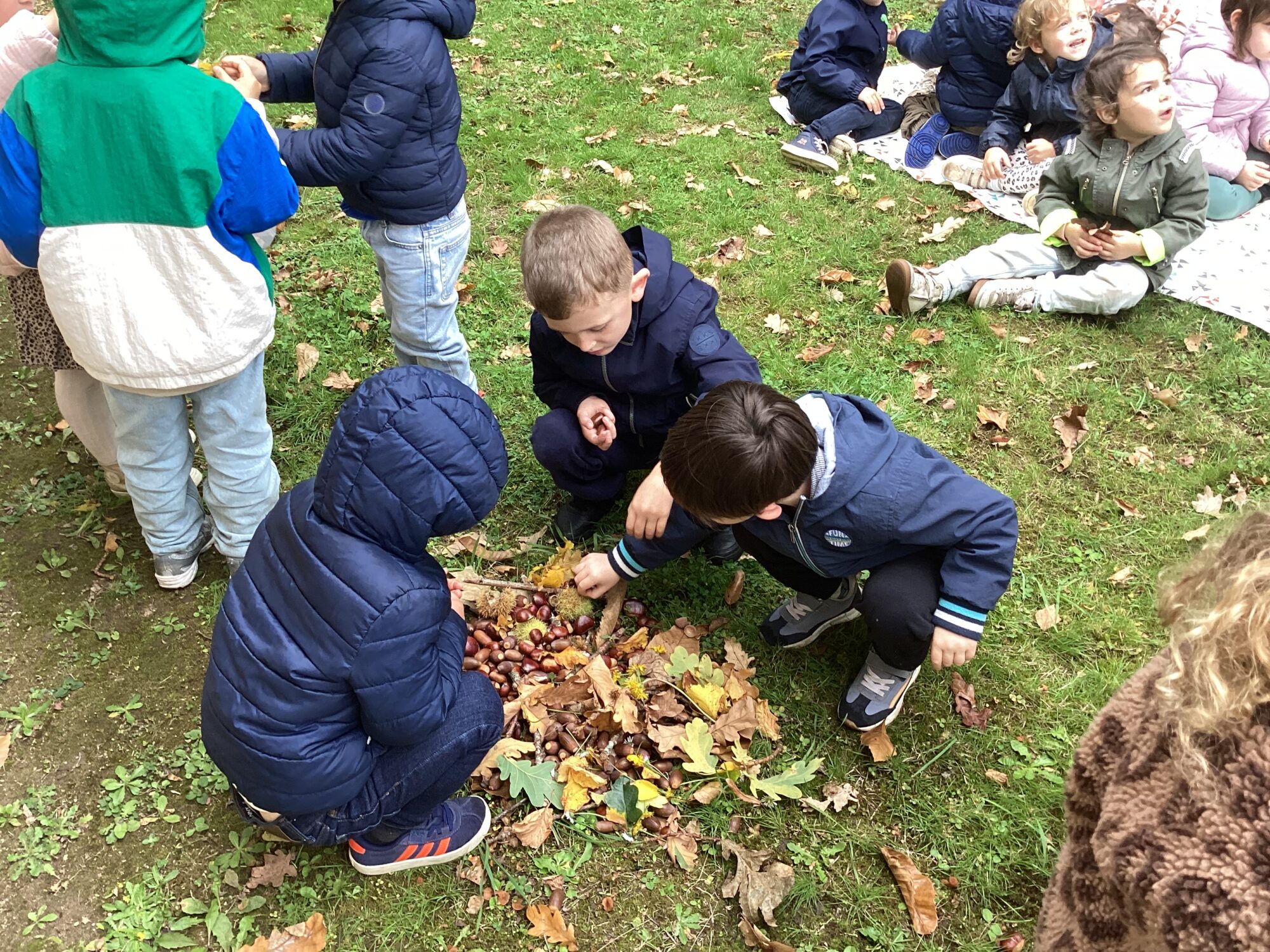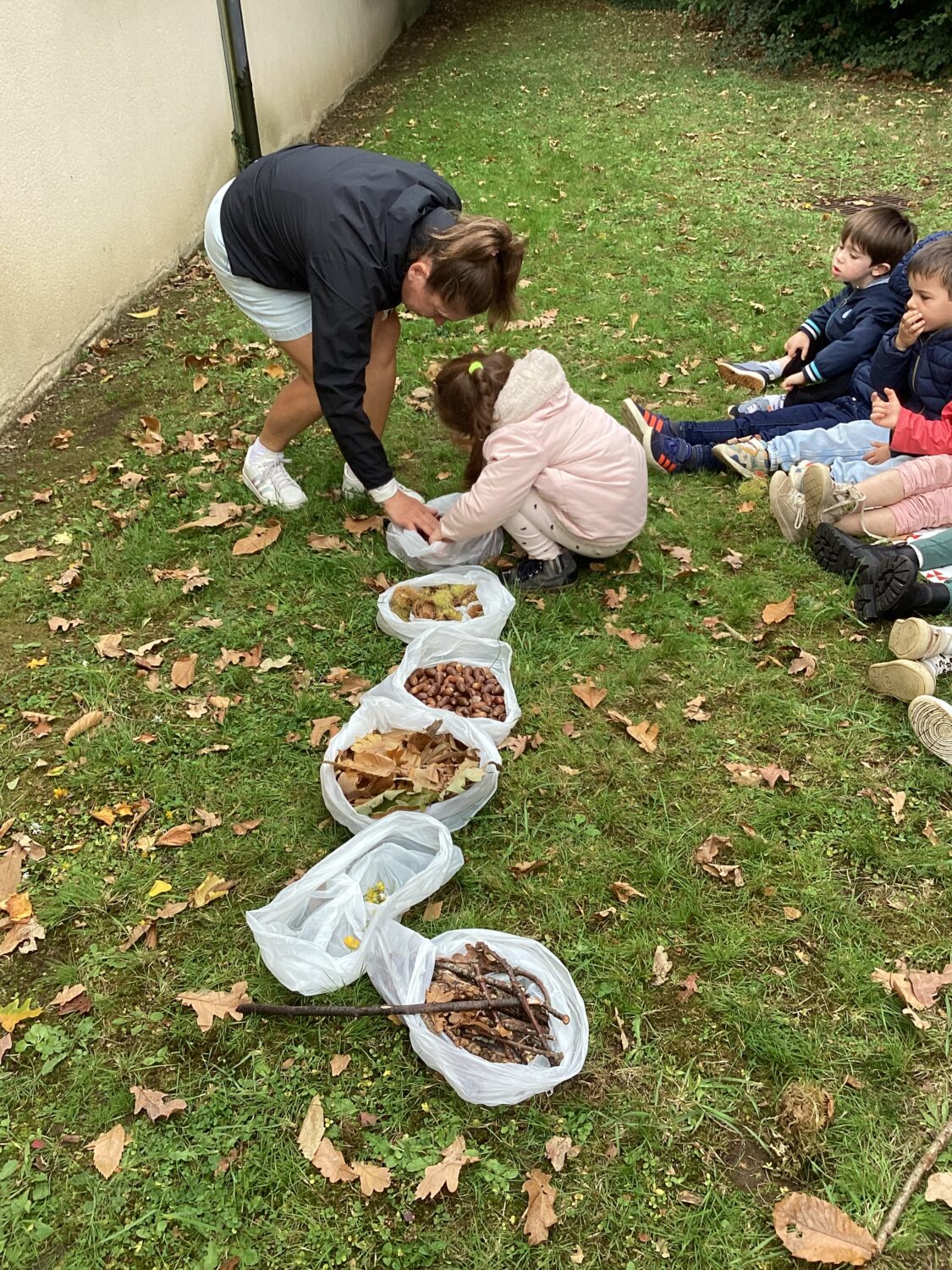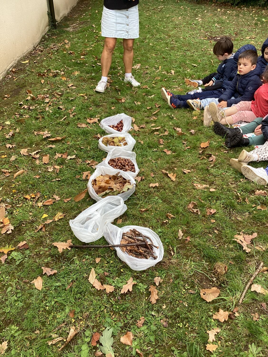 Pour cette activité, nous avons récolté différents éléments présents dans l environnement : feuille, bâtons, glands’, châtaignes, fleurs, bogues, ….après la cueillette nous avons catégorisé les éléments. Puis nous avons associé les mots de vocabulaire correspondant.