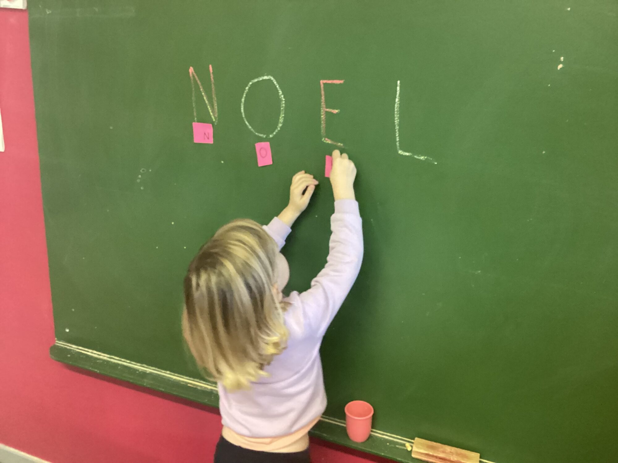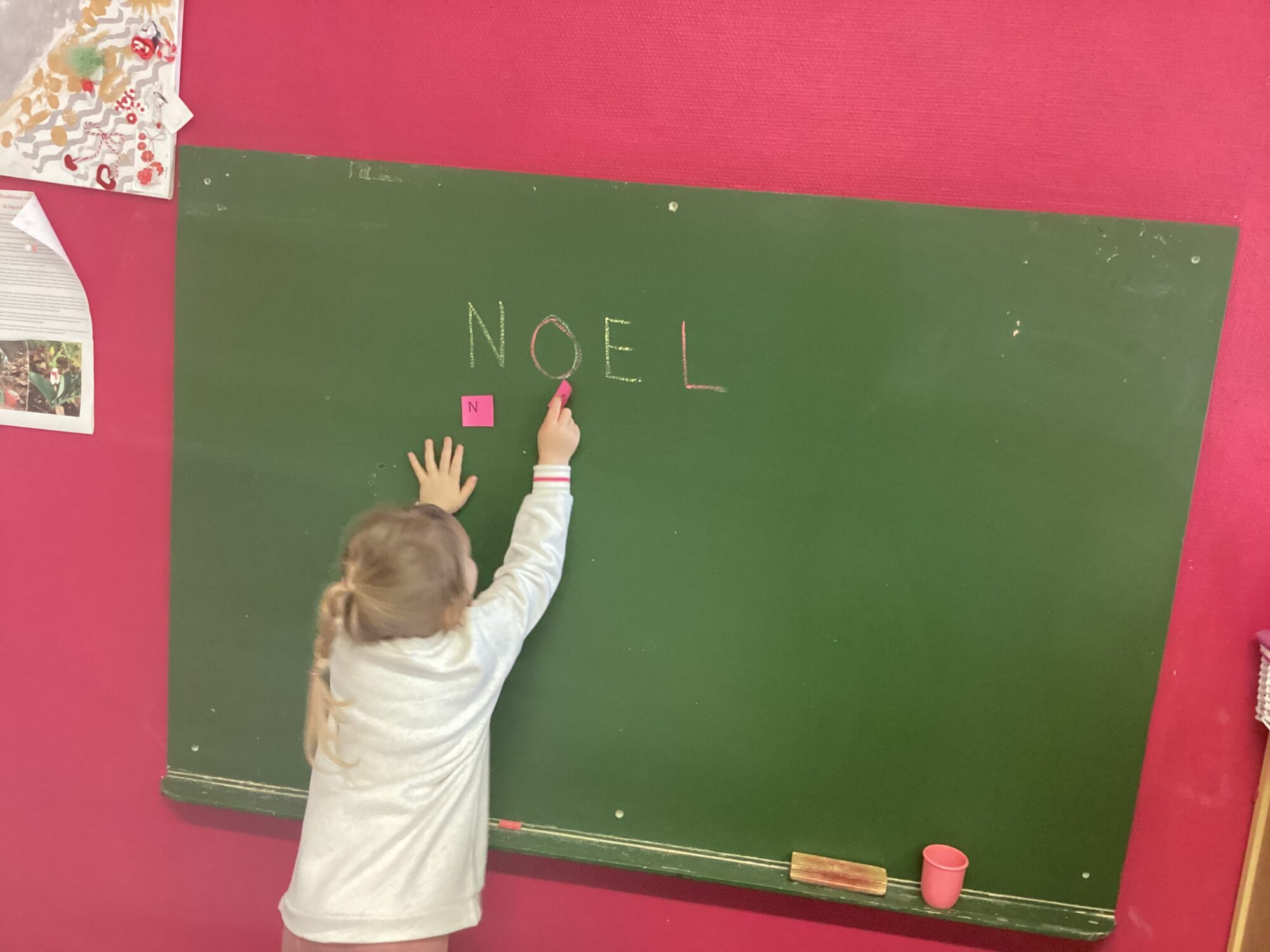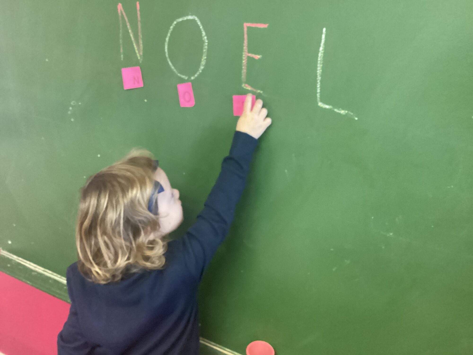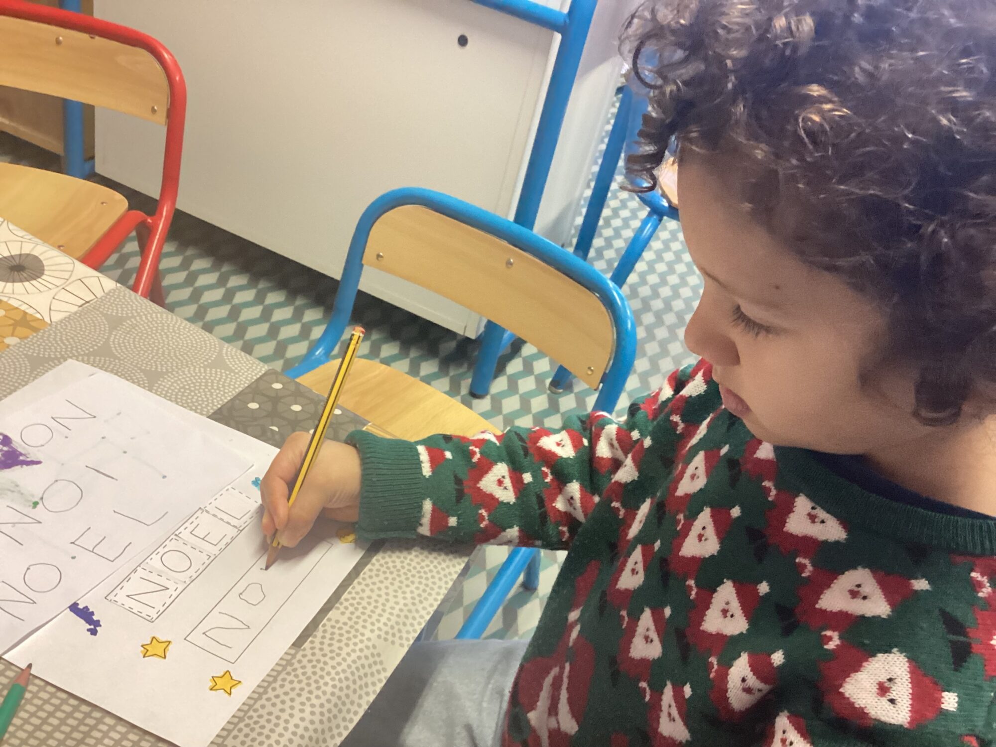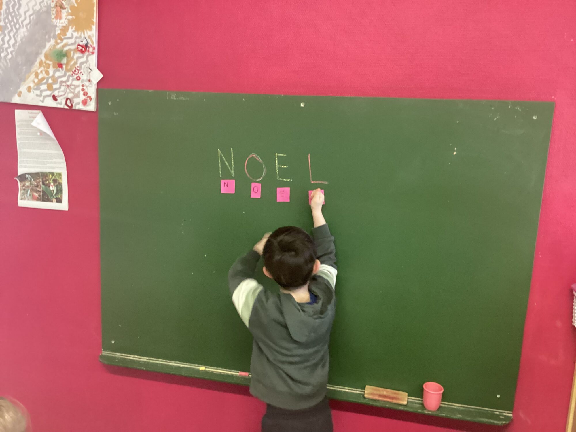 En atelier dirigé, nous étudions le mot NOËL. Reconnaissance des lettres, et écriture.