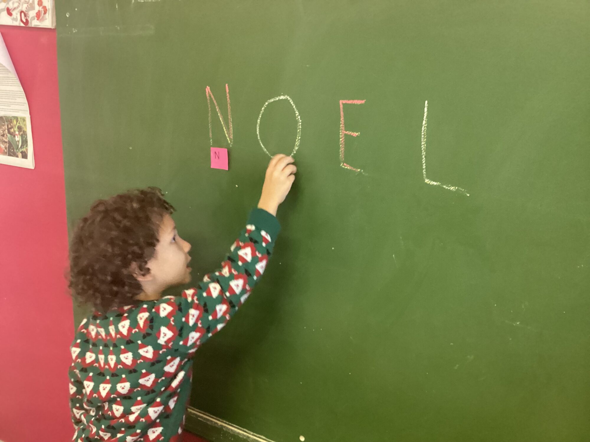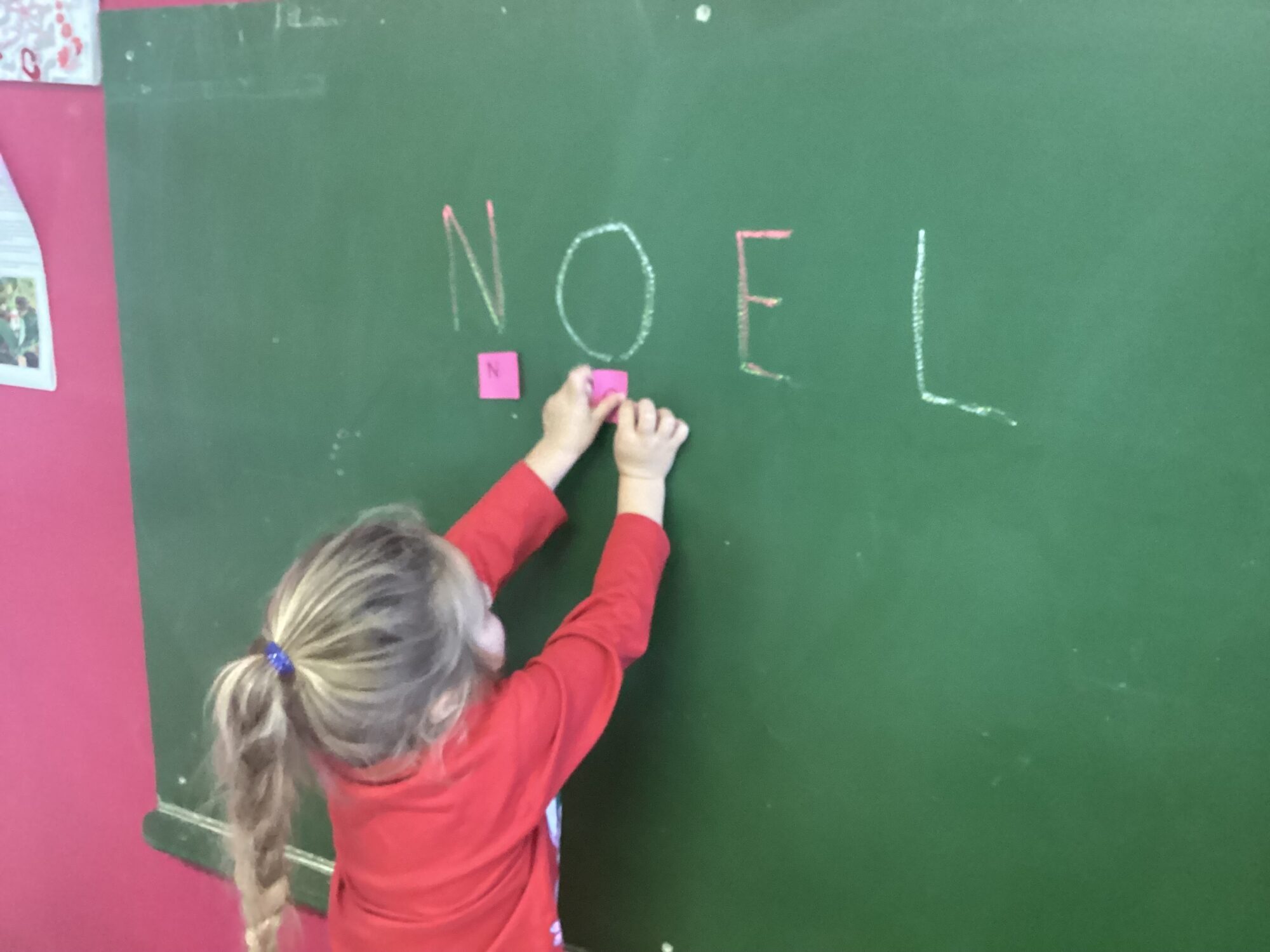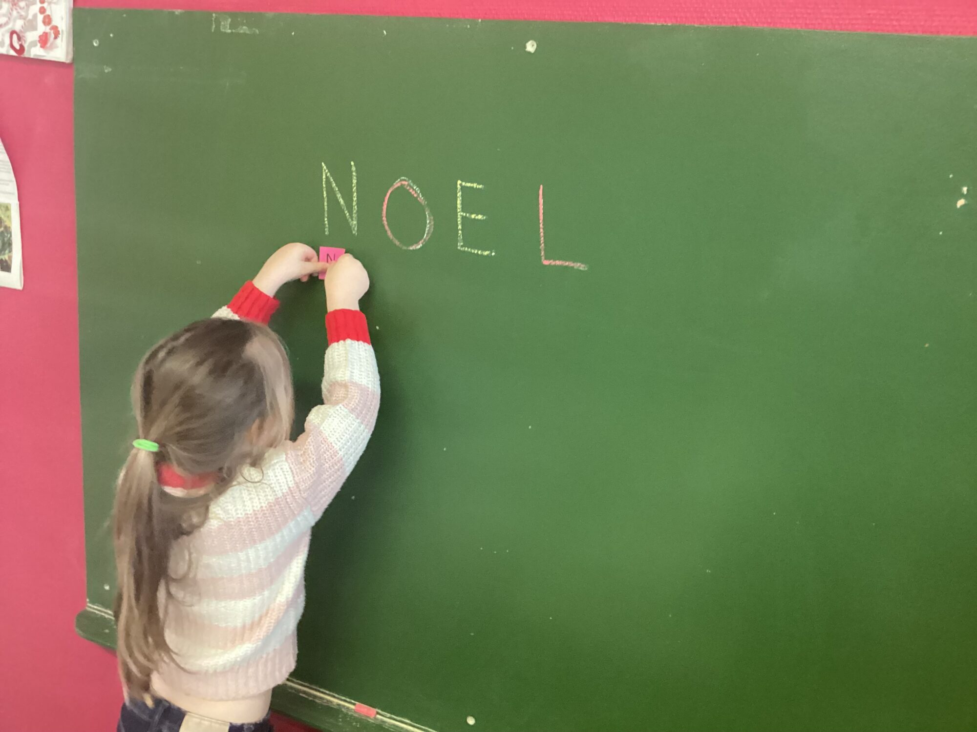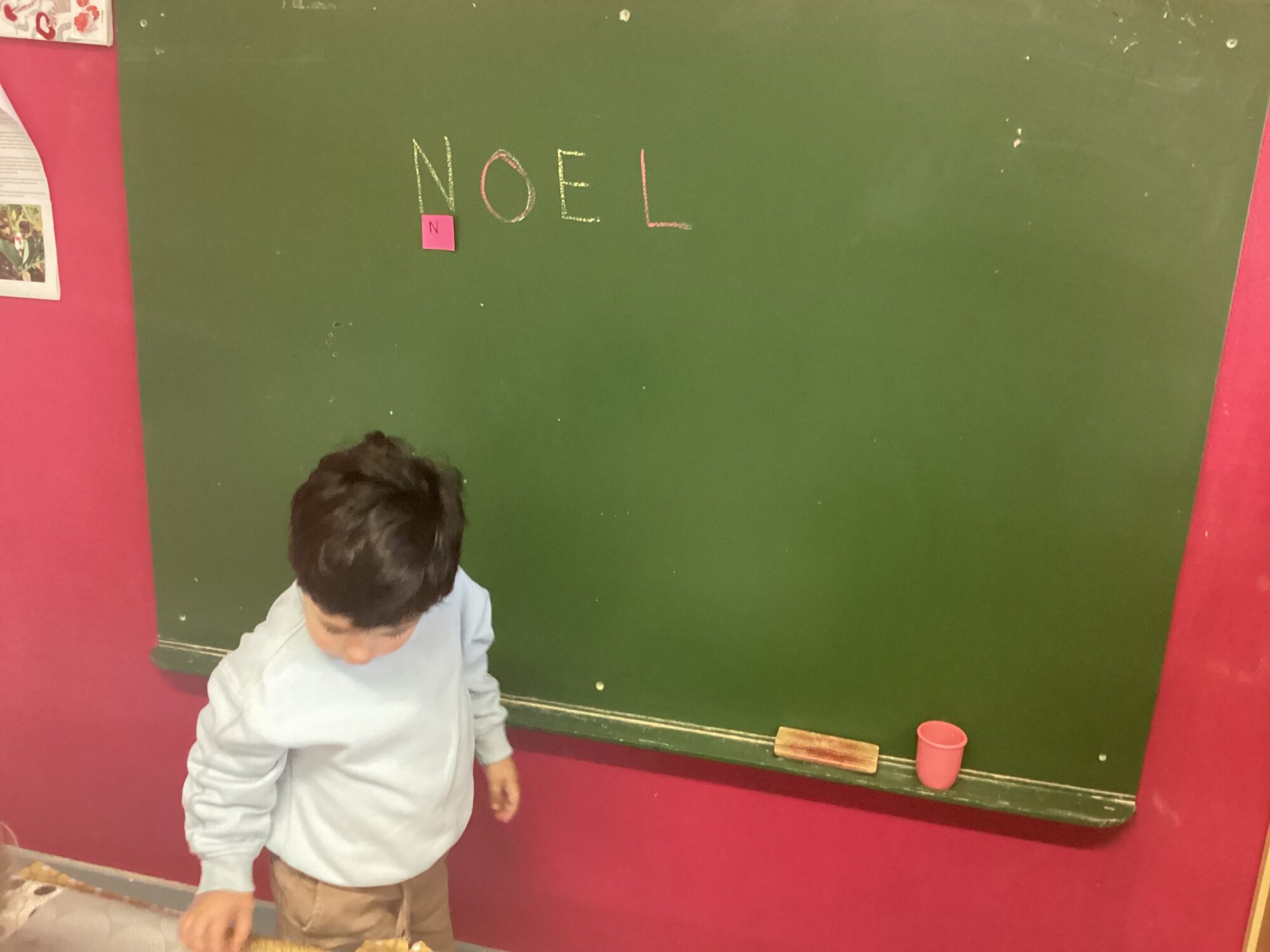 En atelier dirigé, nous étudions le mot NOËL. Reconnaissance des lettres, et écriture.