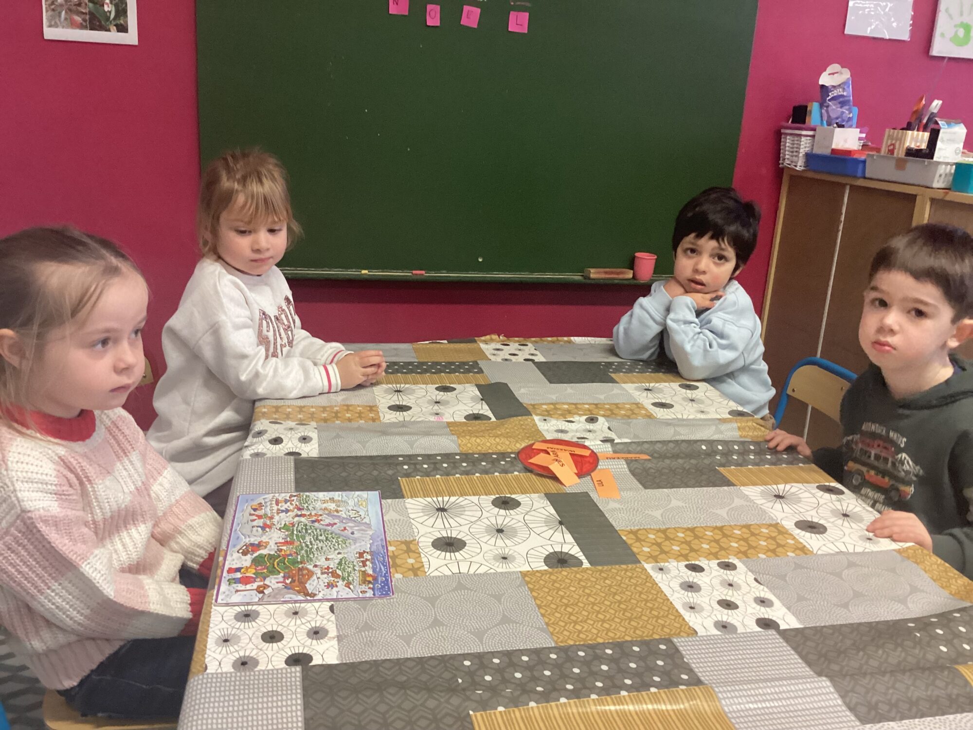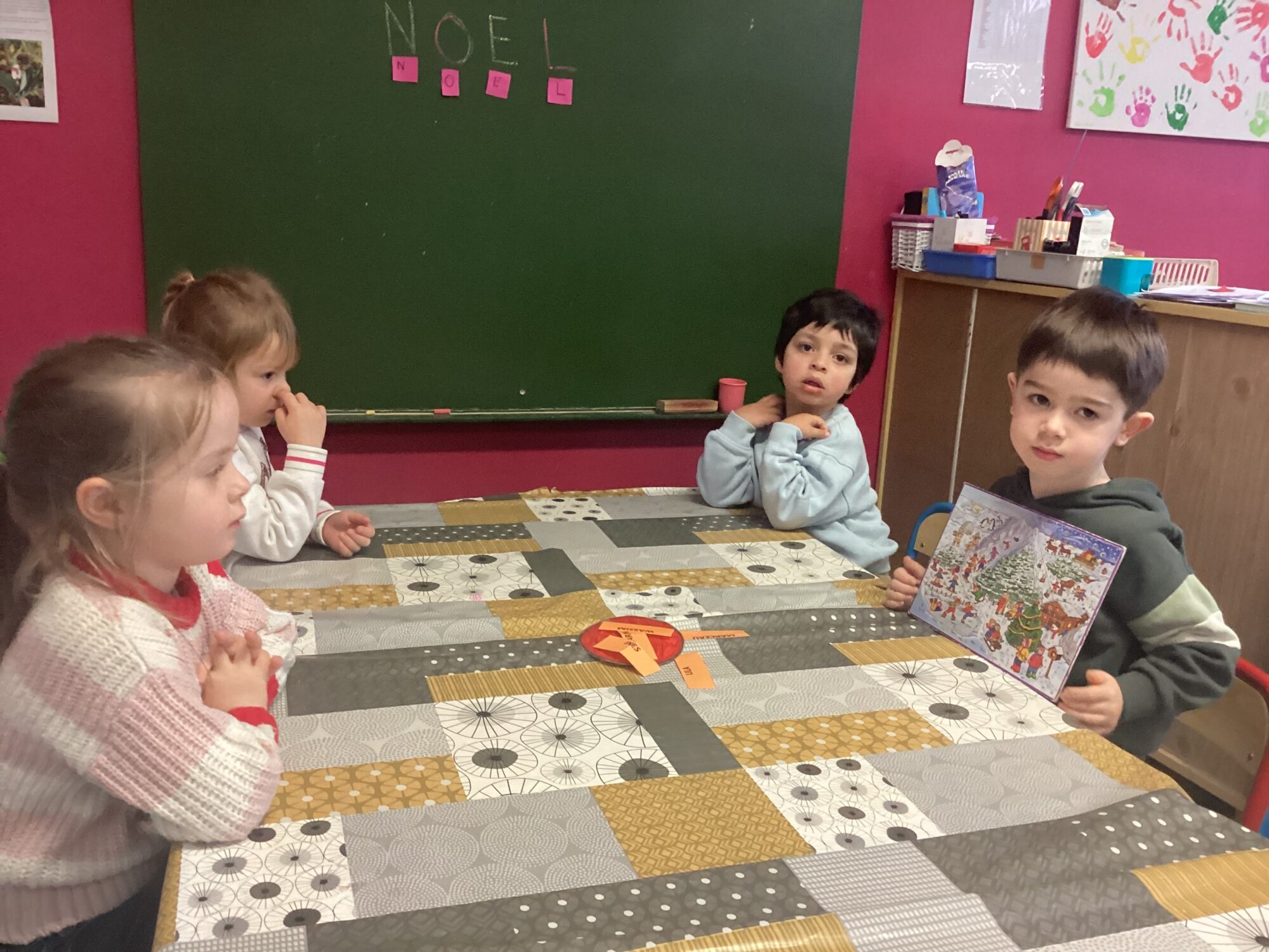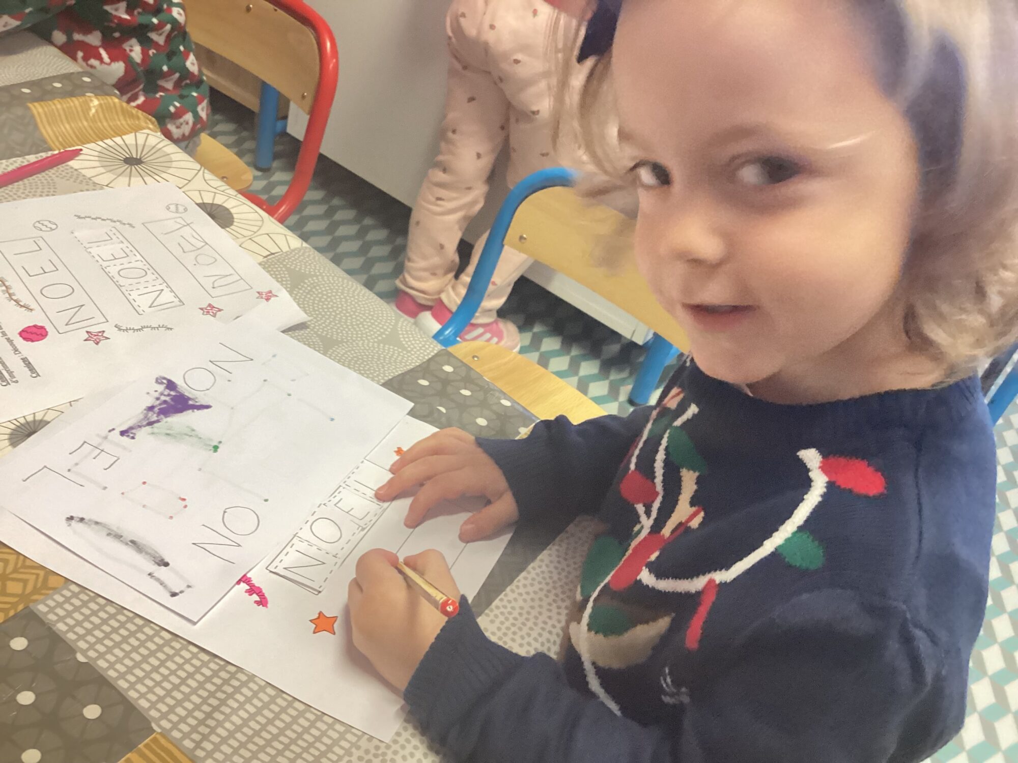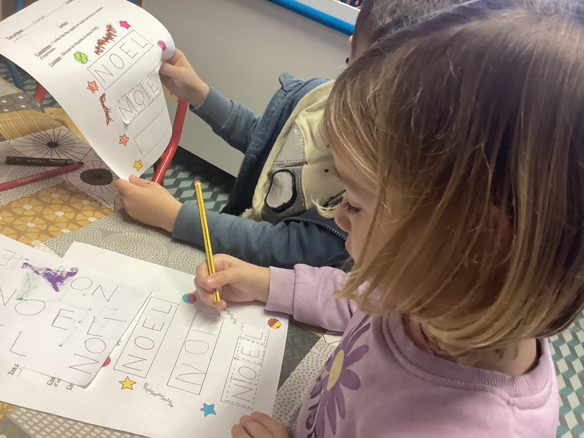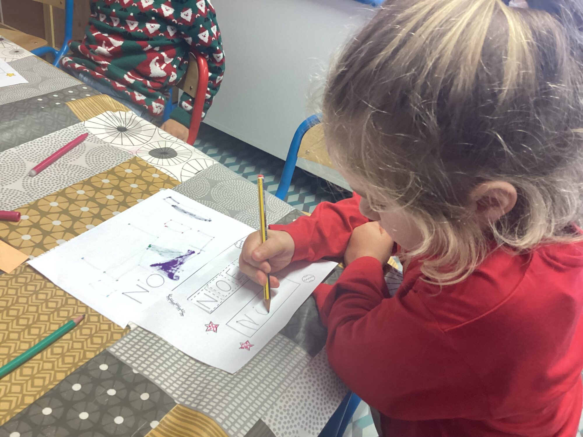 En atelier dirigé, nous étudions le mot NOËL. Reconnaissance des lettres, et écriture.