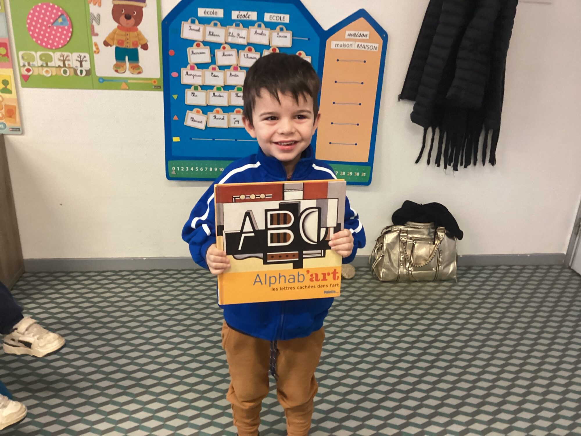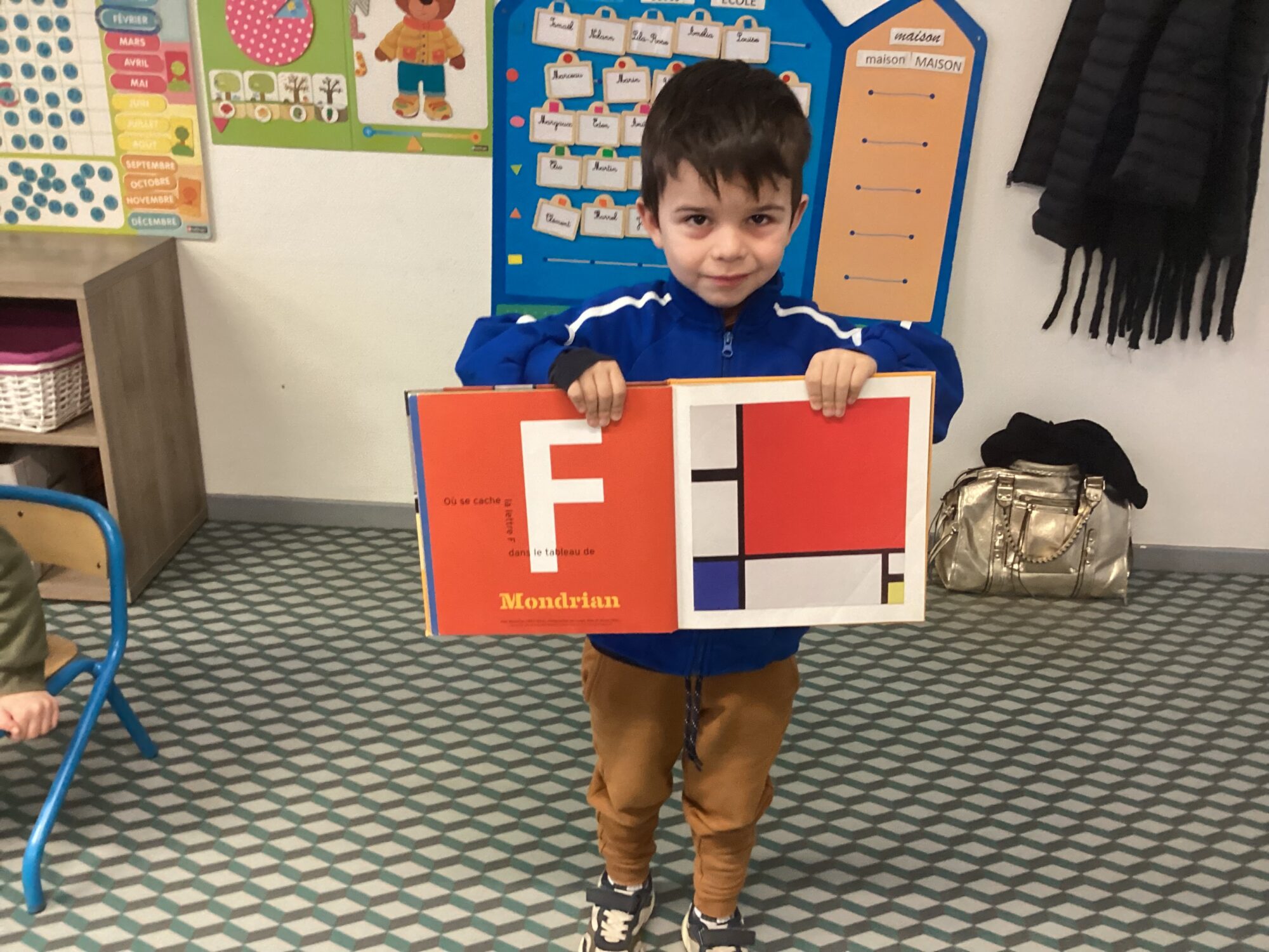 Martin a apporté un livre sur différents peintres, dans les œuvres exposées les lettres de l alphabet devaient être retrouvées. Nous avons également reparlé de Piet Mondrian et Robert Delaunay, …. Nous avons ainsi réactivé les connaissances sur les productions observées. Merci Martin !