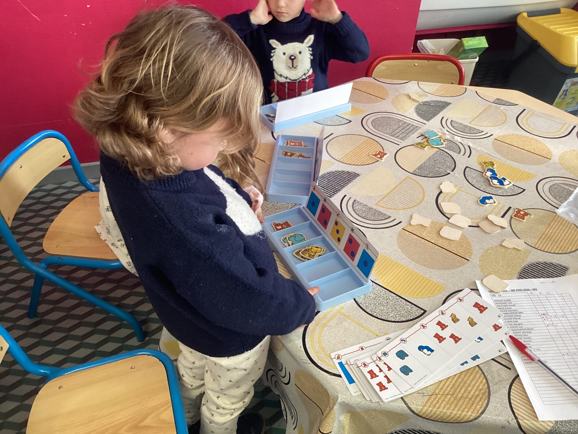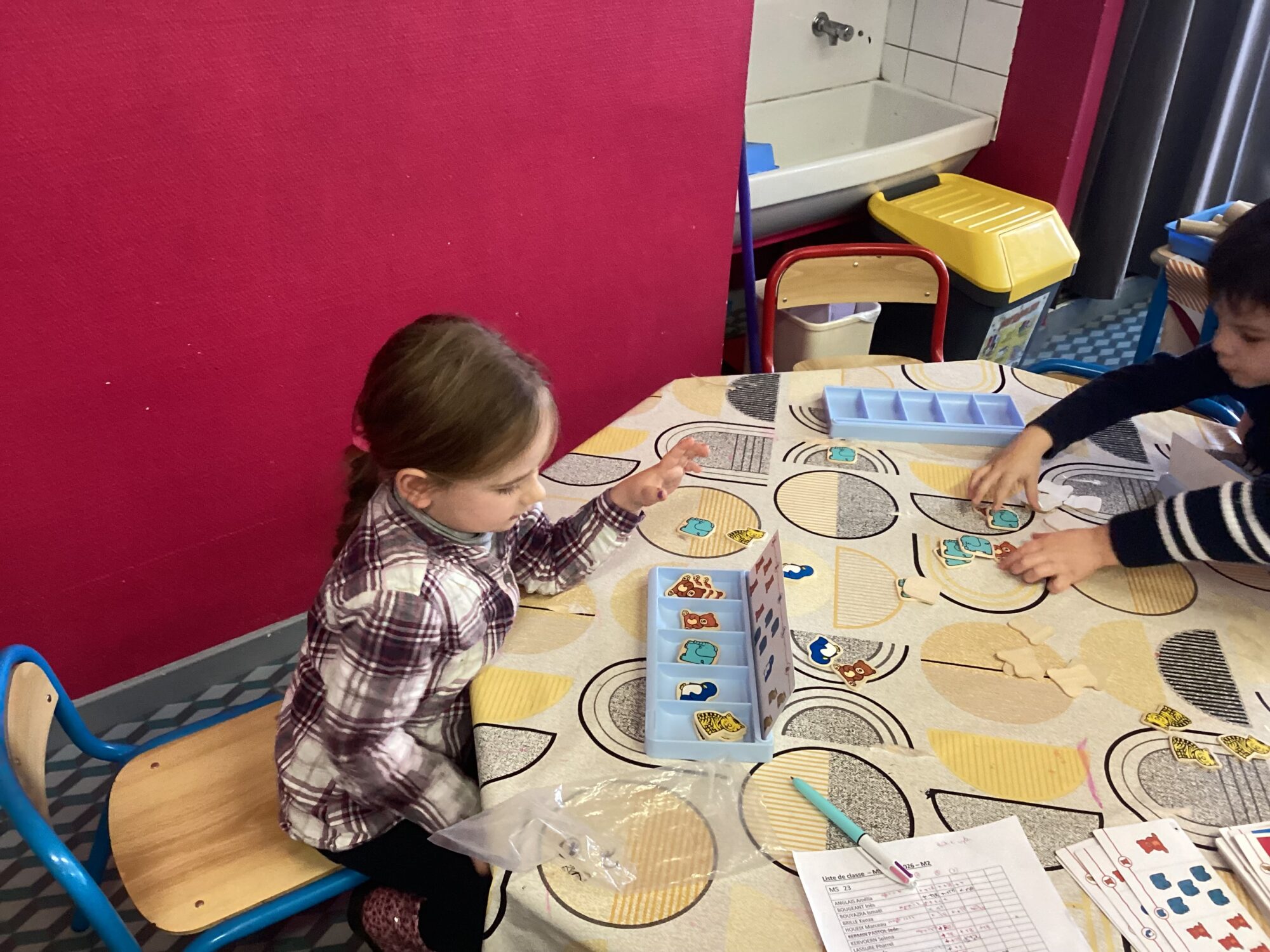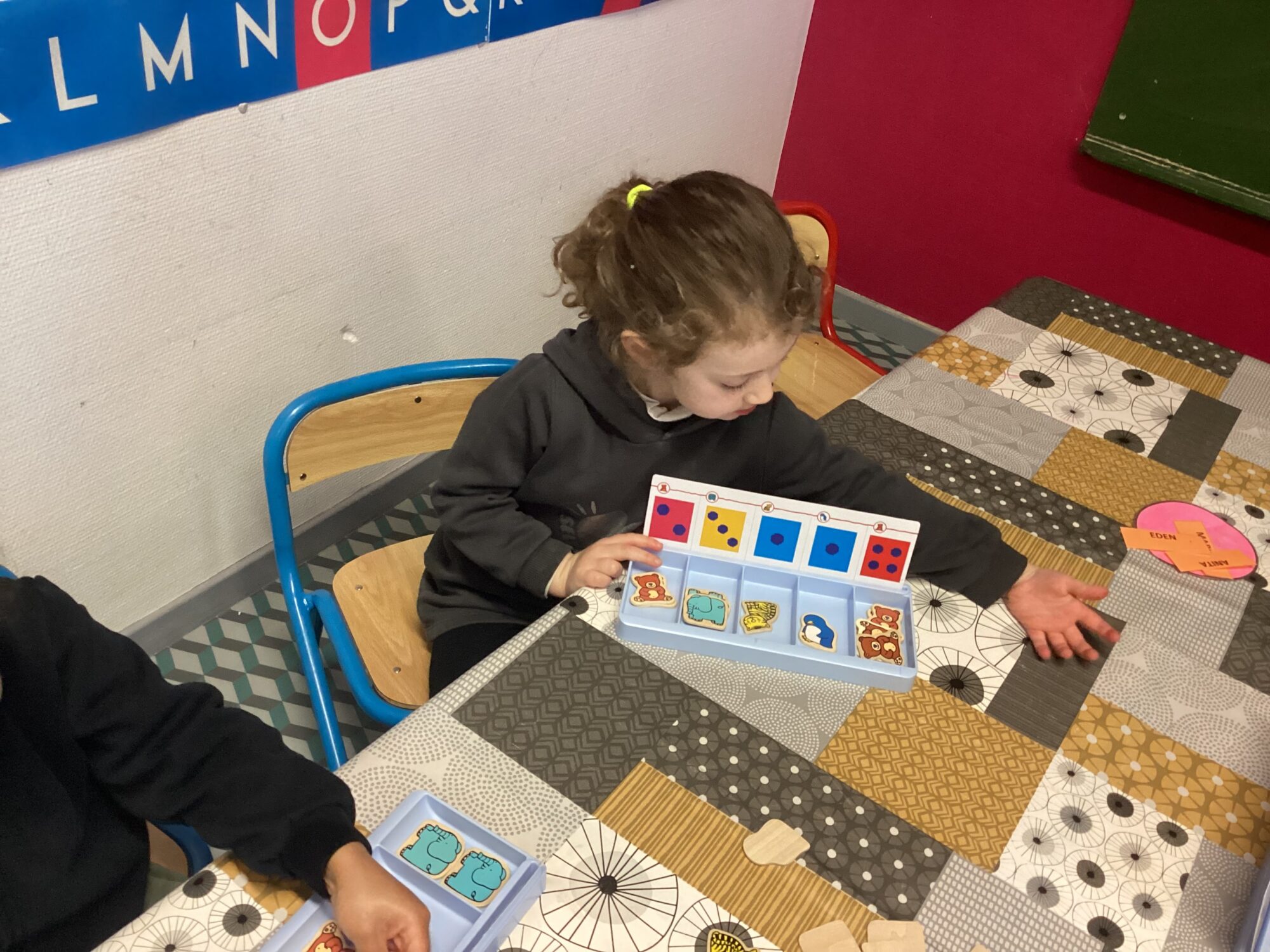 Dans cet atelier, nous avons une approche du nombre. En manipulant des animaux, puis des jetons ( plus symboliques), les élèves apprennent à dénombrer, à réaliser des collections de quantité donnée, à reconnaître les nombres de 1 à 5.