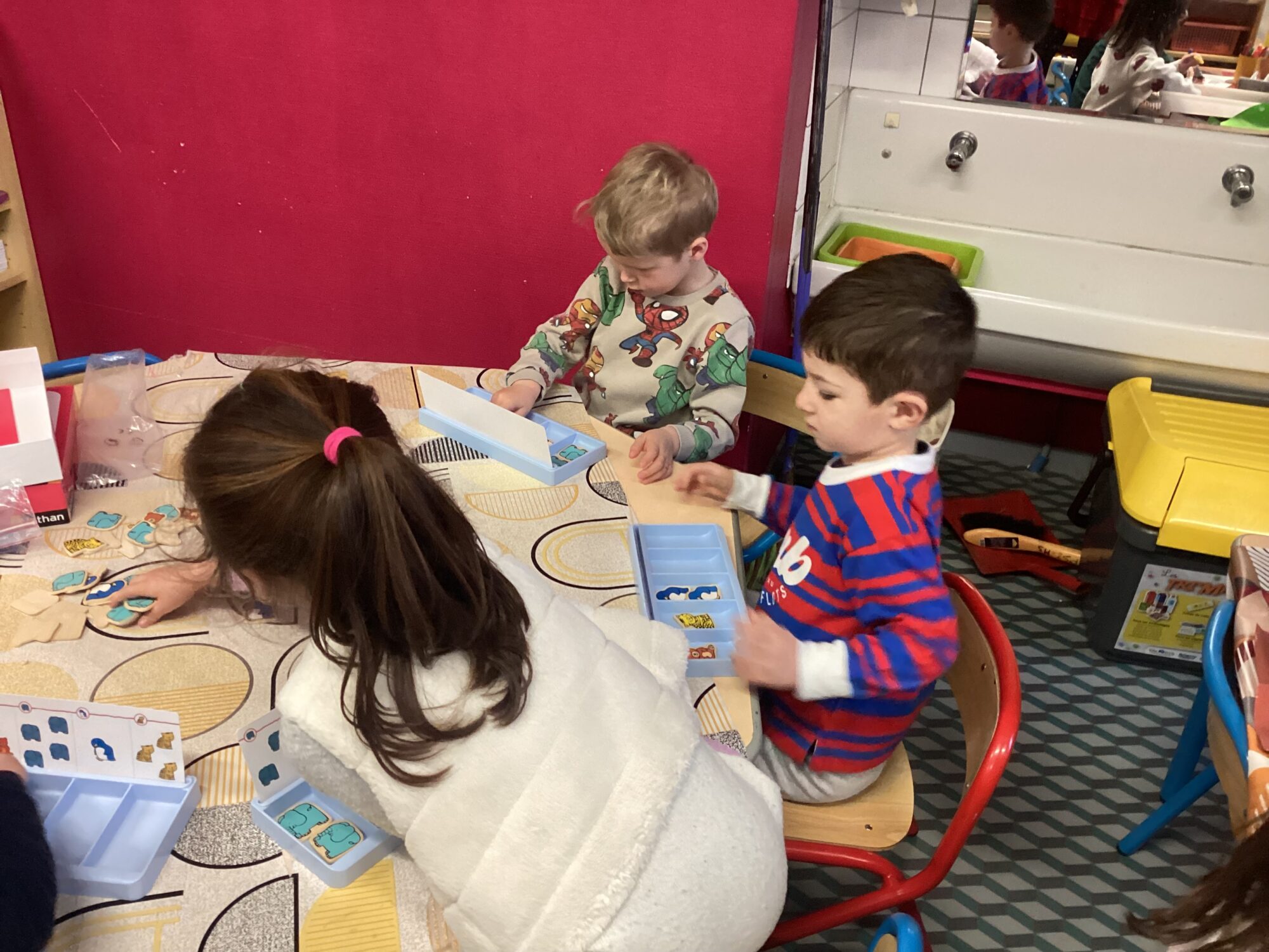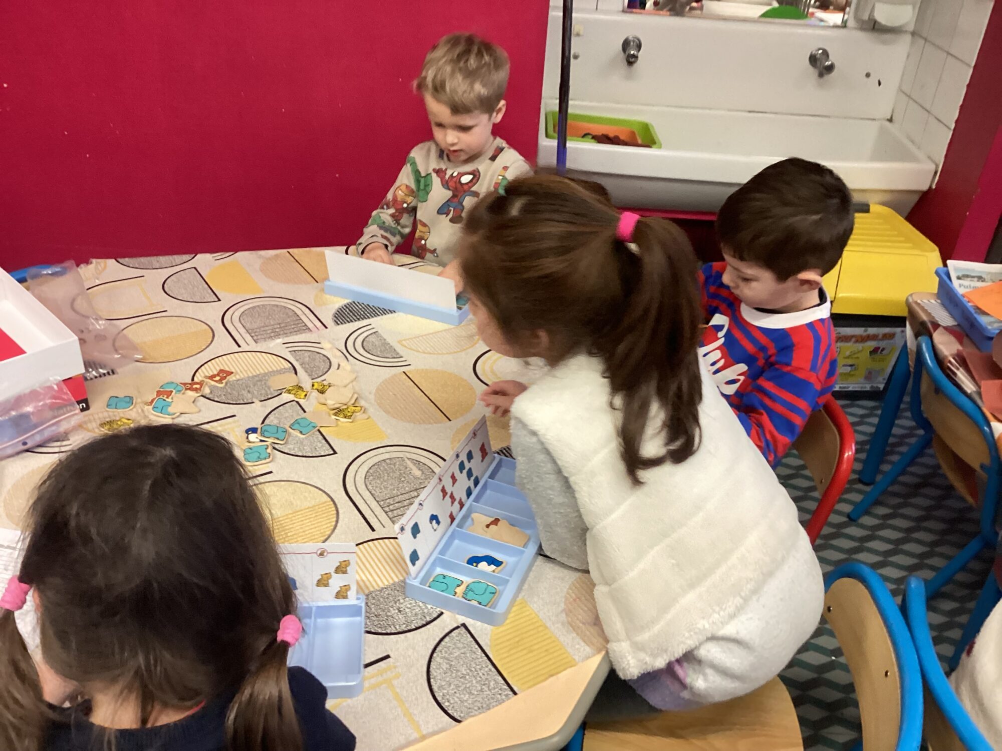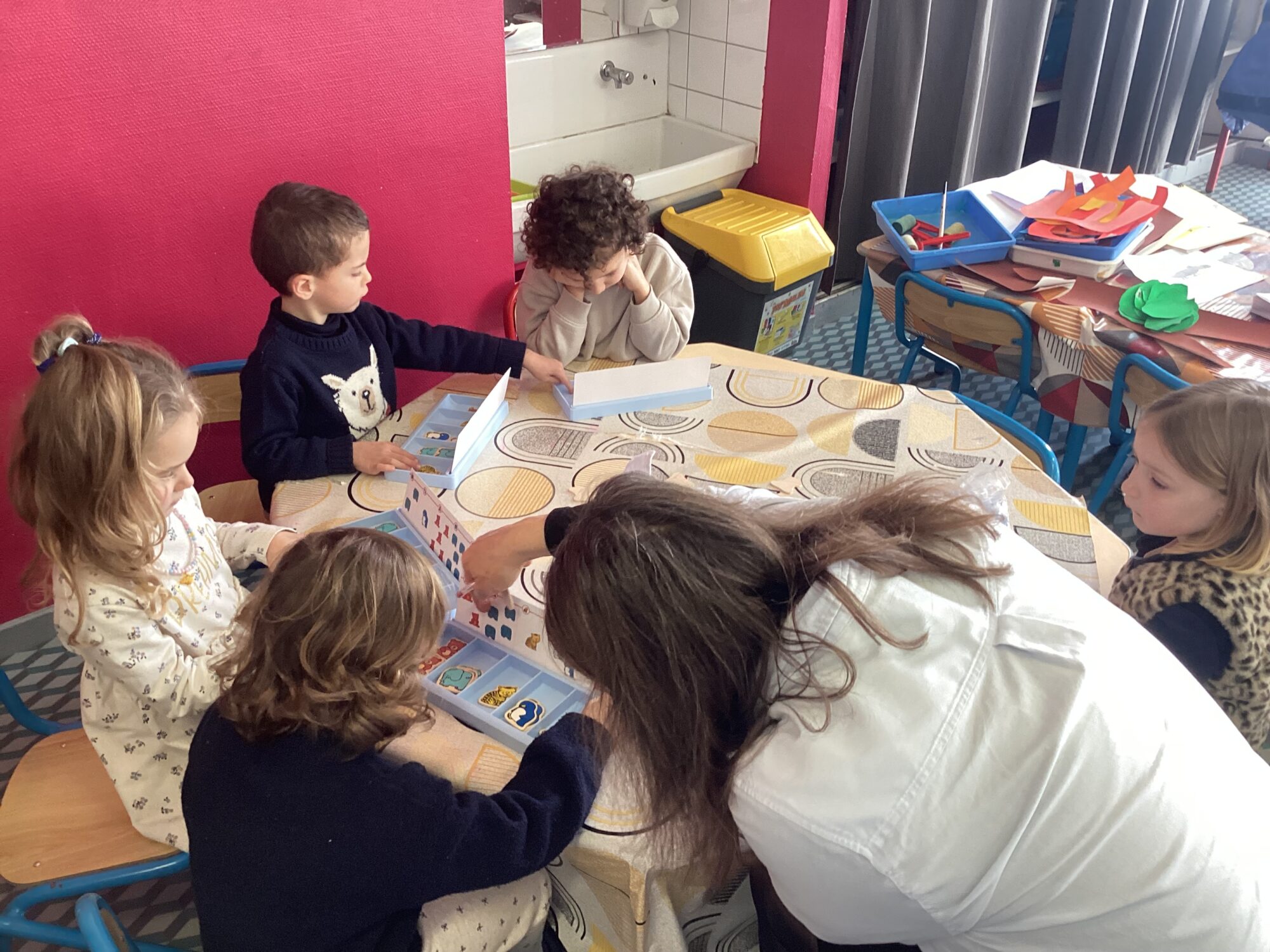 Dans cet atelier, nous avons une approche du nombre. En manipulant des animaux, puis des jetons ( plus symboliques), les élèves apprennent à dénombrer, à réaliser des collections de quantité donnée, à reconnaître les nombres de 1 à 5.