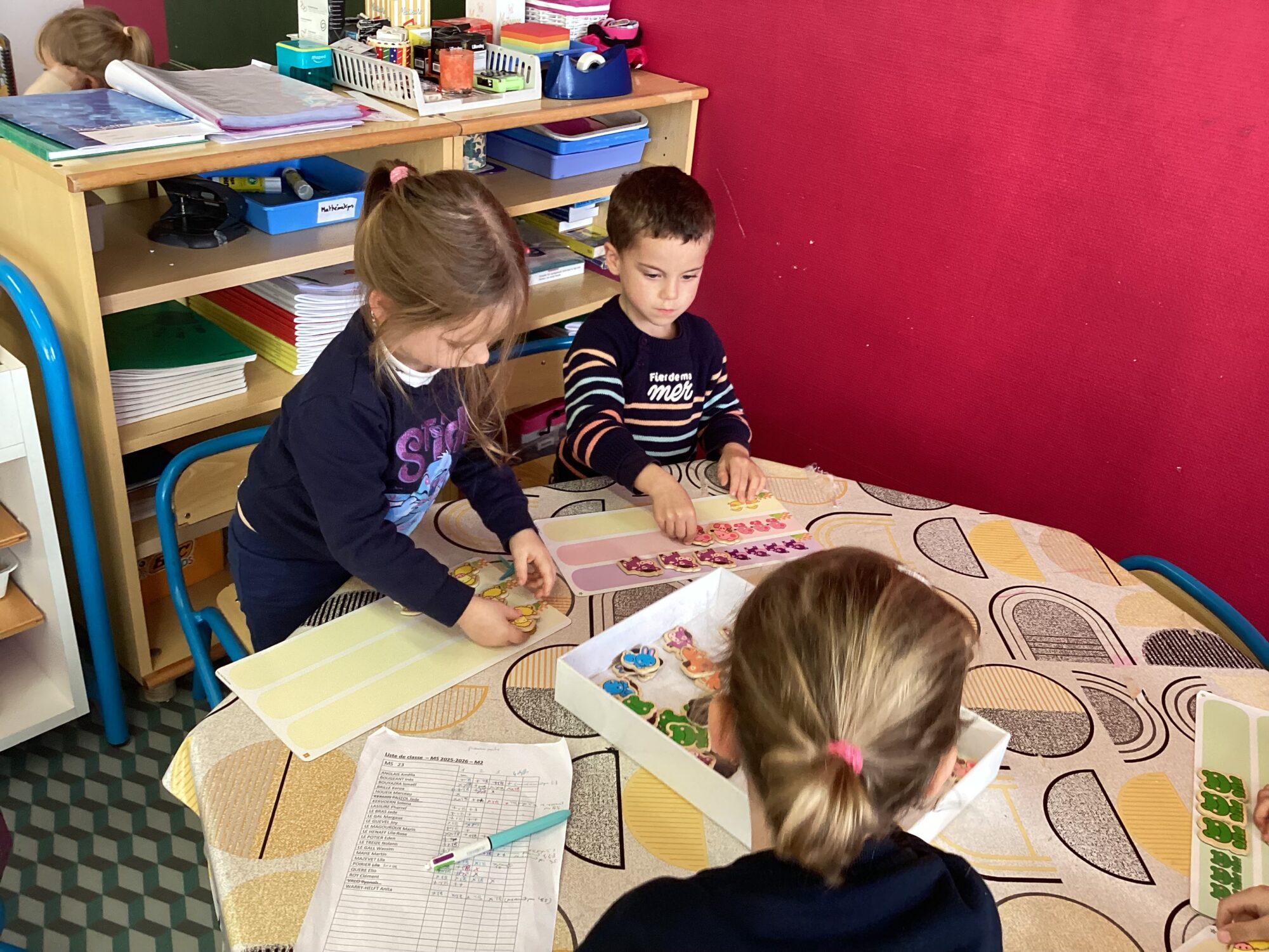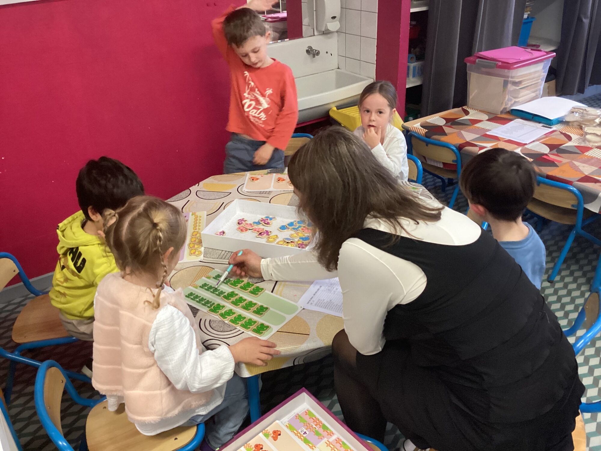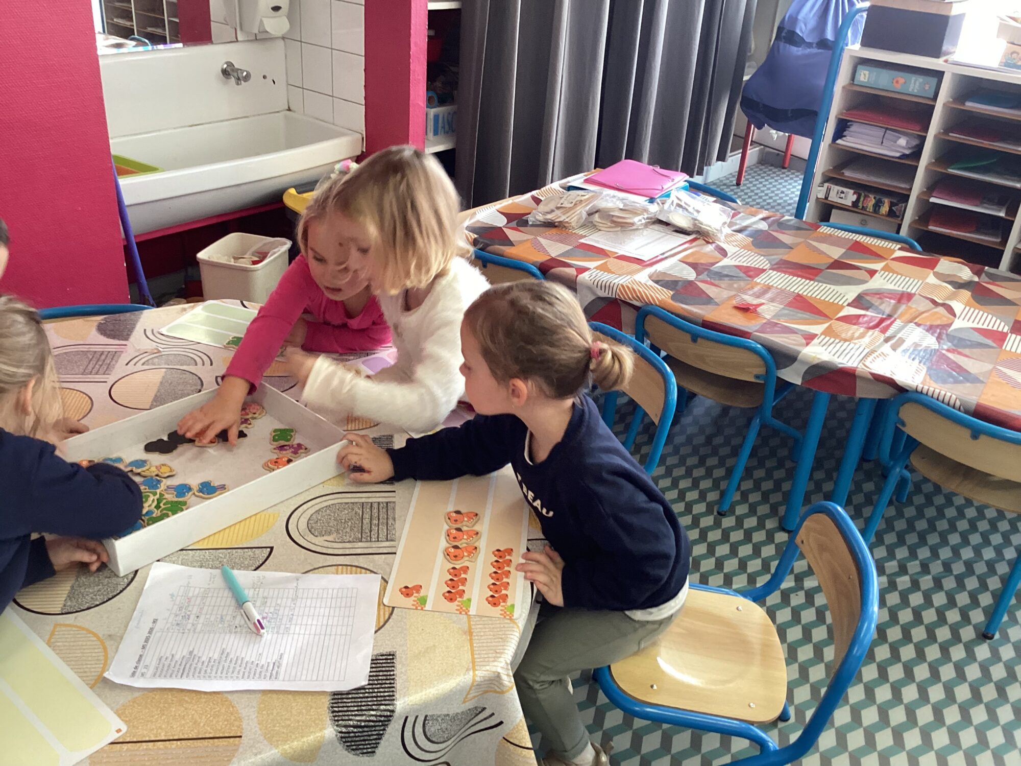 Dans cet atelier évolutif en fonction de chacun, les élèves travaillent le dénombrement d’une quantité, la construction d’une collection dont la quantité est donnée par une collection témoin, la constellation du dé, ou par son écriture chiffrée.