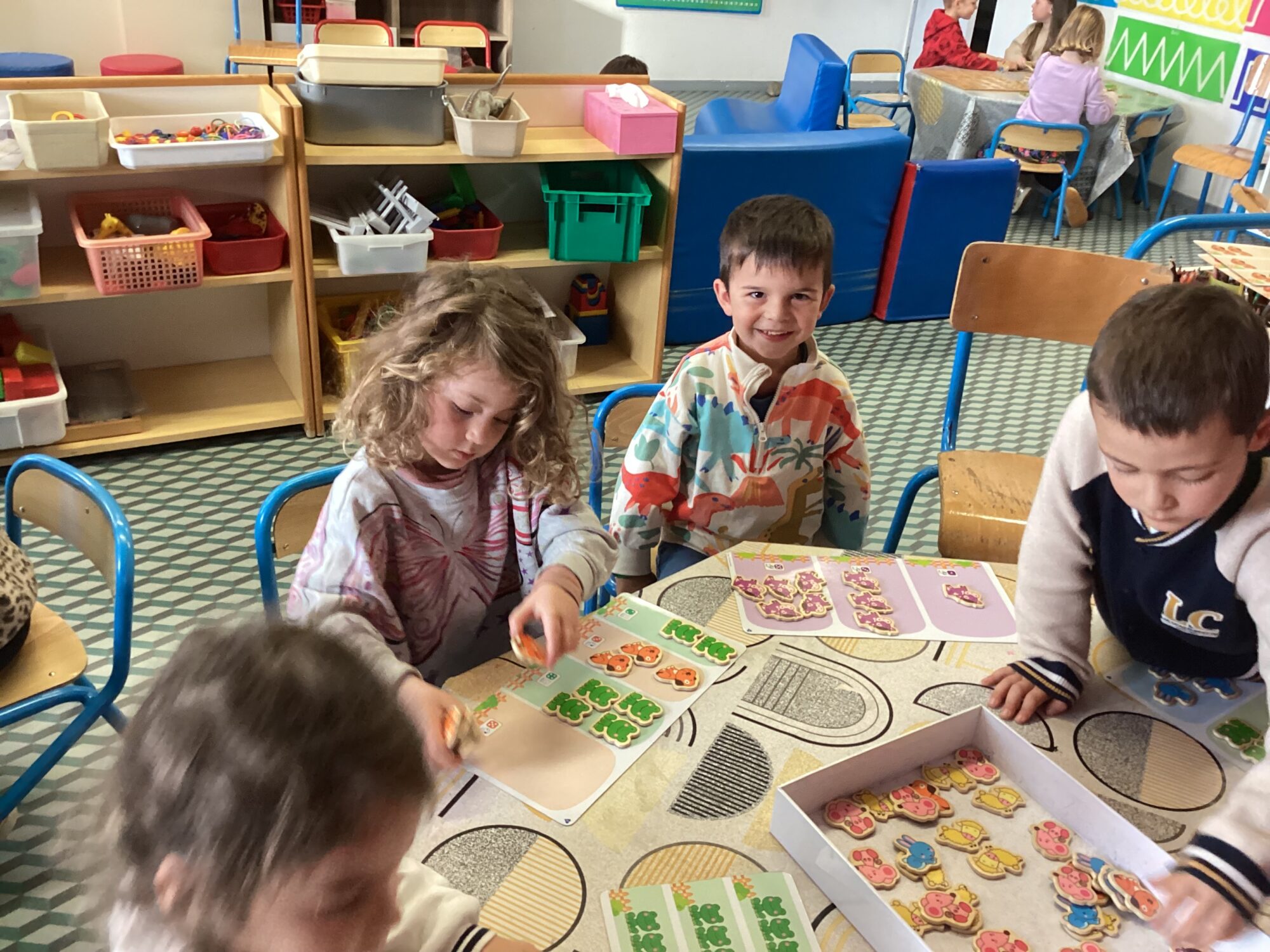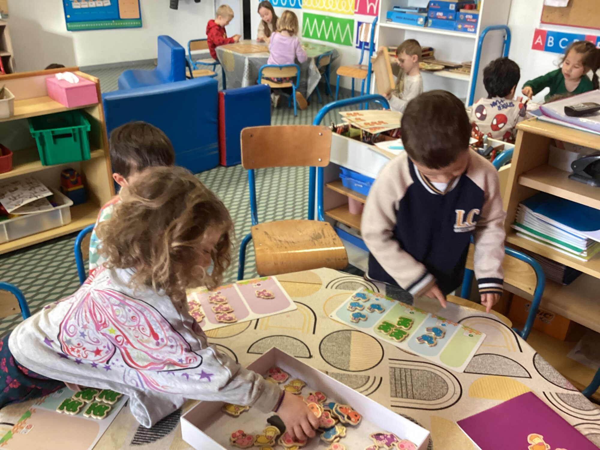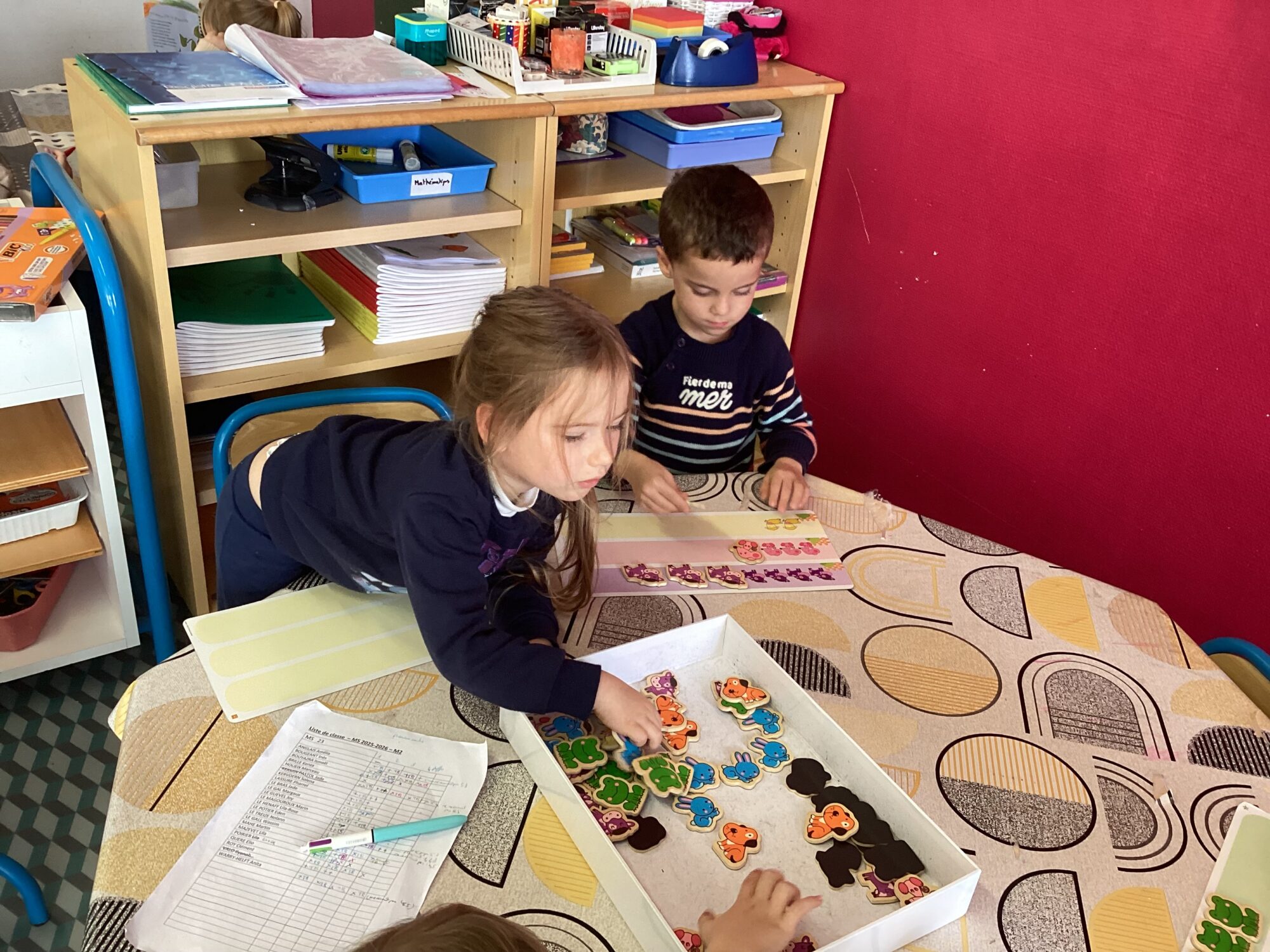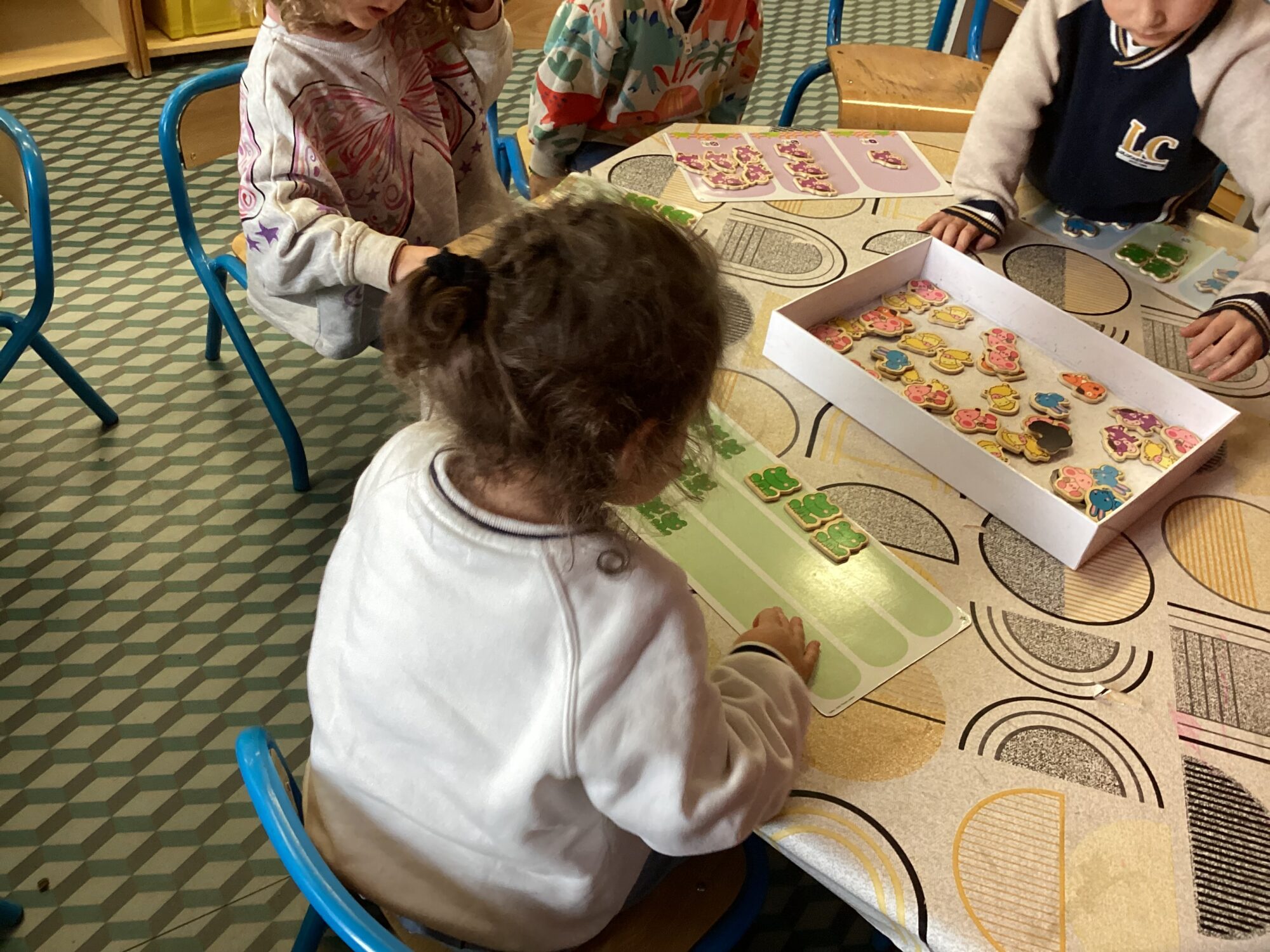 Dans cet atelier évolutif en fonction de chacun, les élèves travaillent le dénombrement d’une quantité, la construction d’une collection dont la quantité est donnée par une collection témoin, la constellation du dé, ou par son écriture chiffrée.