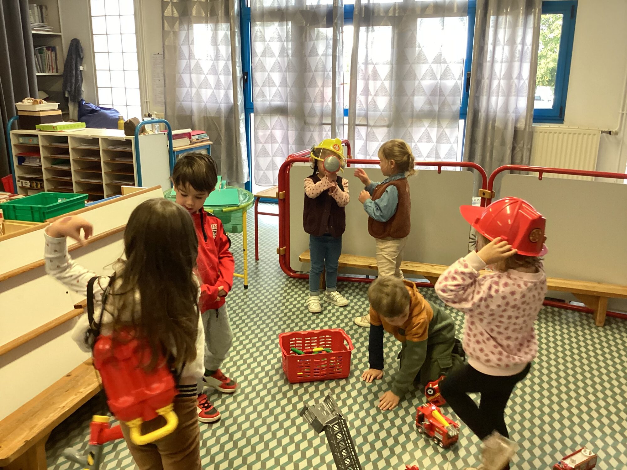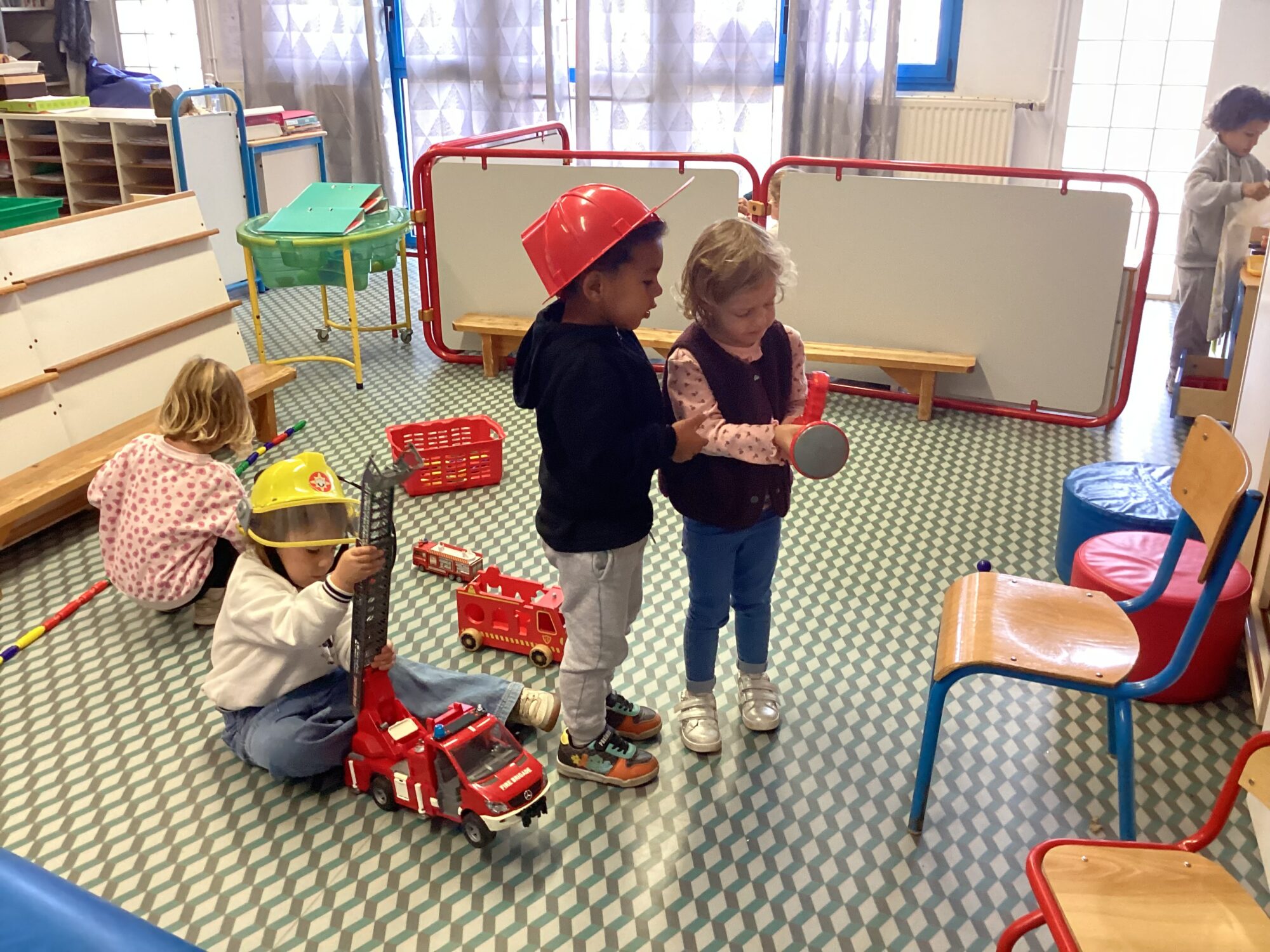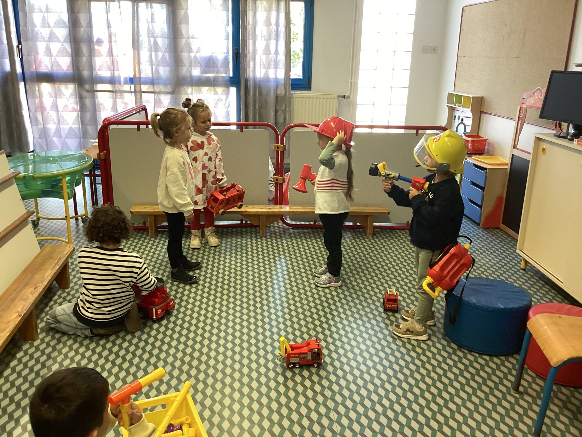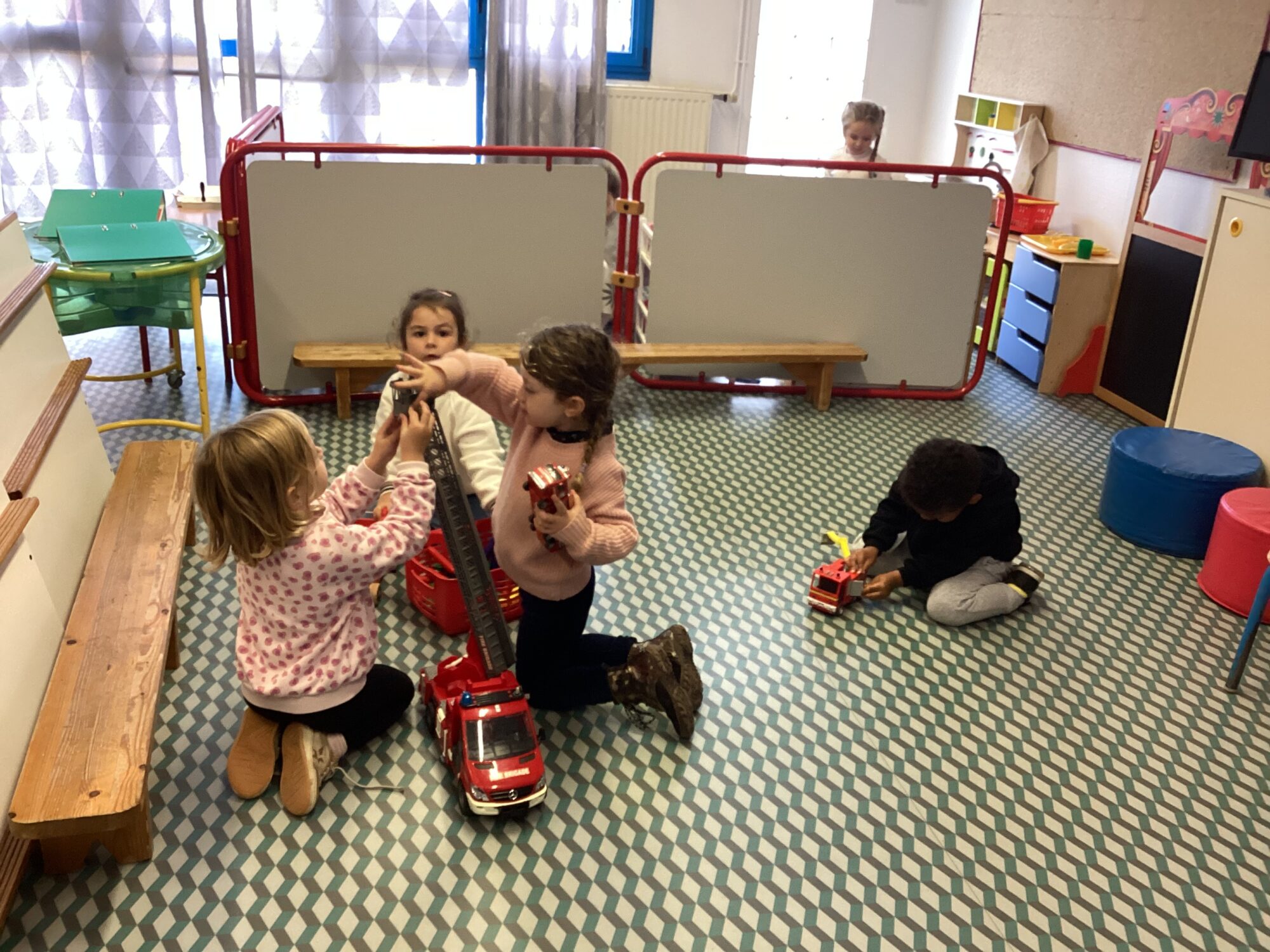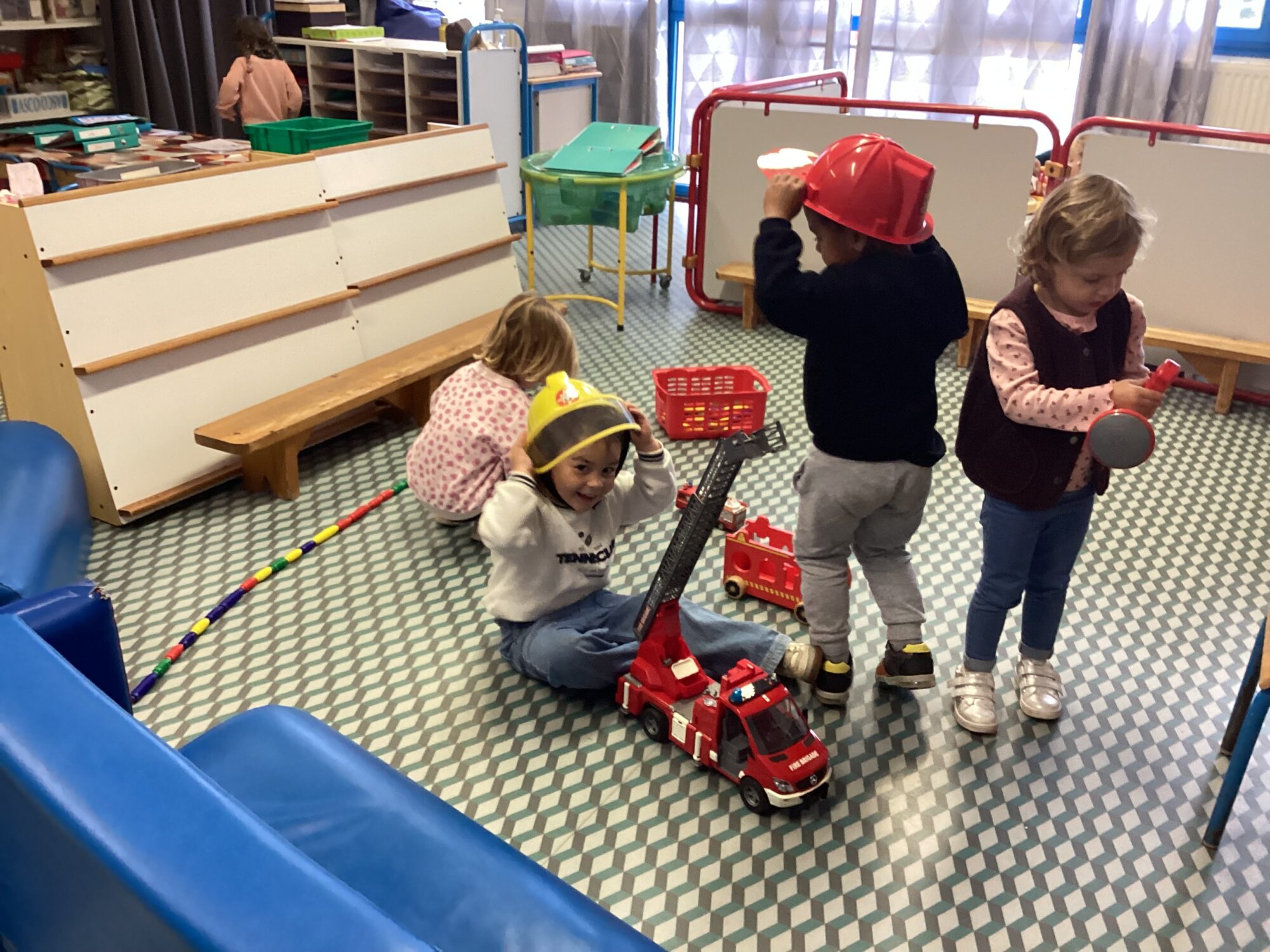 Les enfants apprécient notre coin «  pompiers », après les ateliers par petits groupes les enfants peuvent jouer en autonomie.