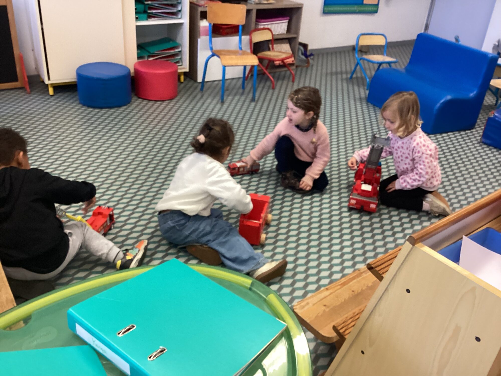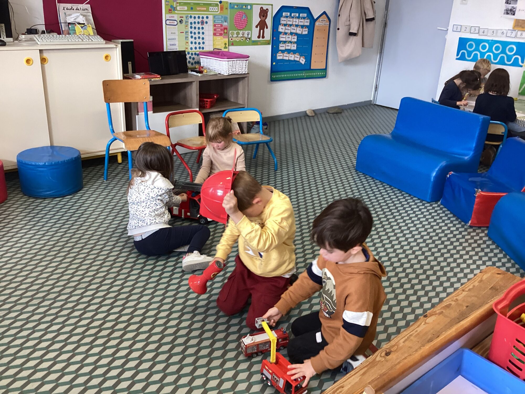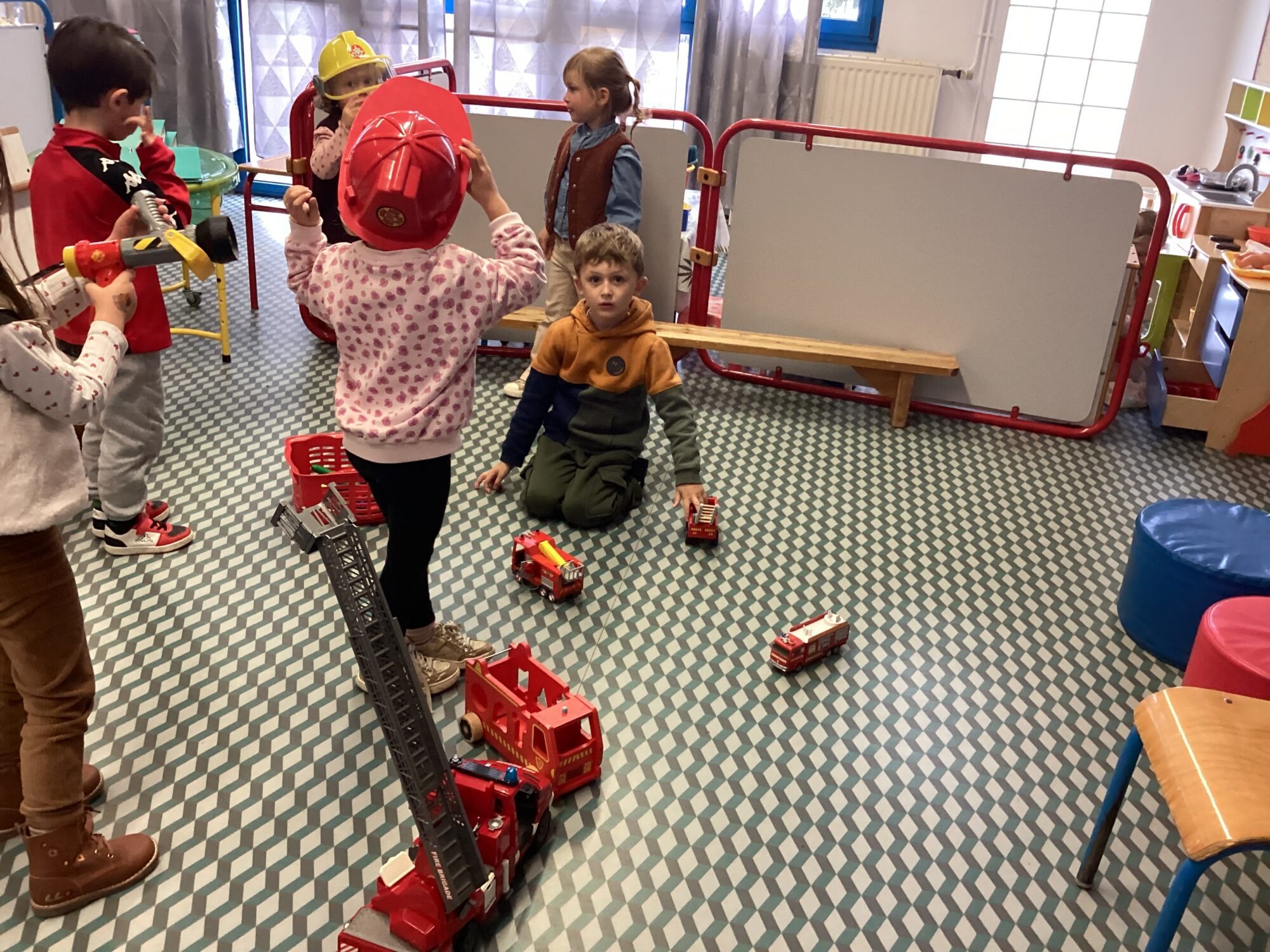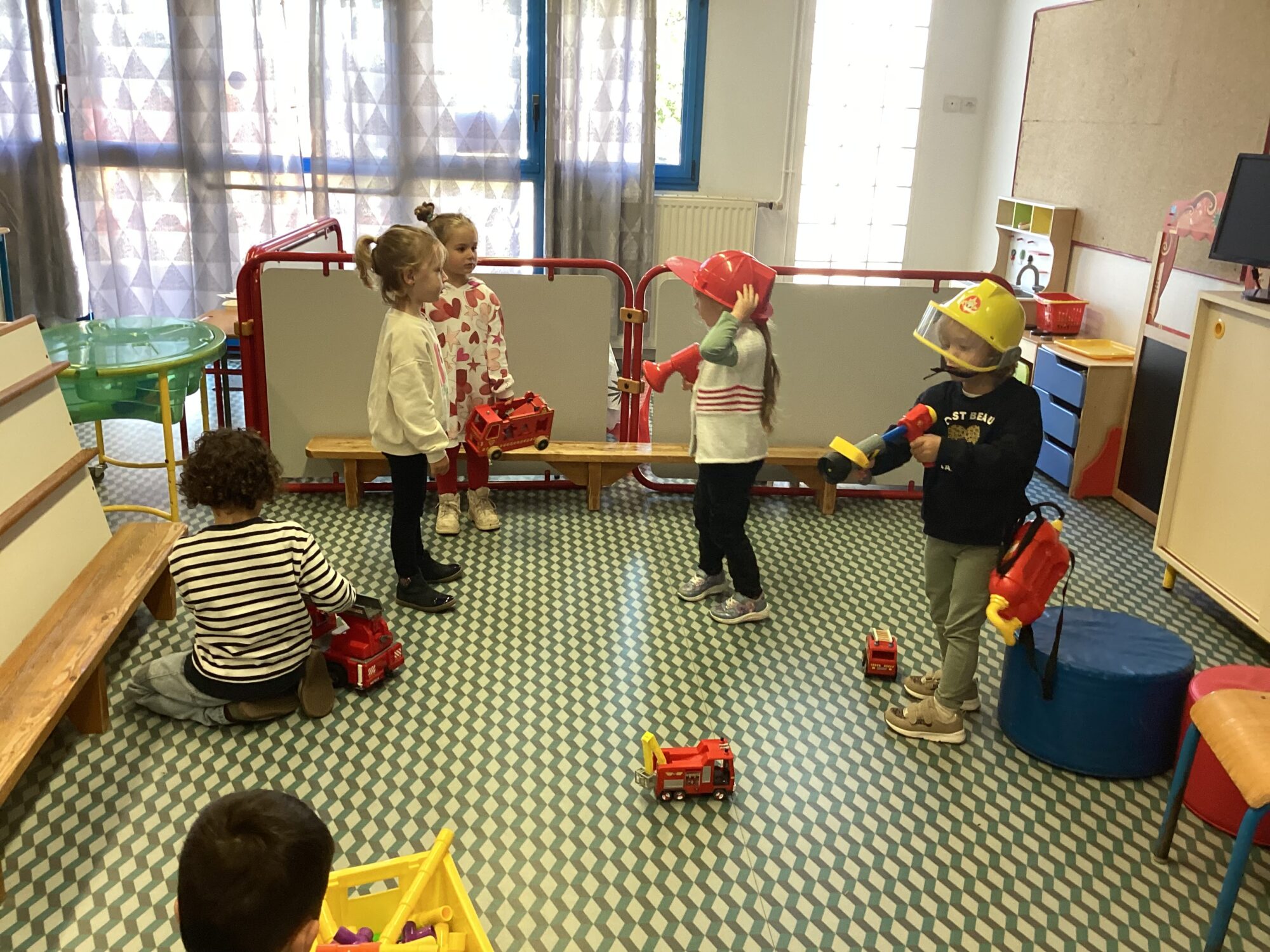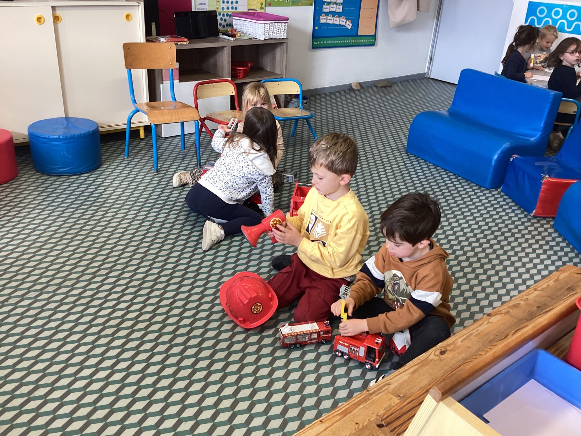 Les enfants apprécient notre coin «  pompiers », après les ateliers par petits groupes les enfants peuvent jouer en autonomie.