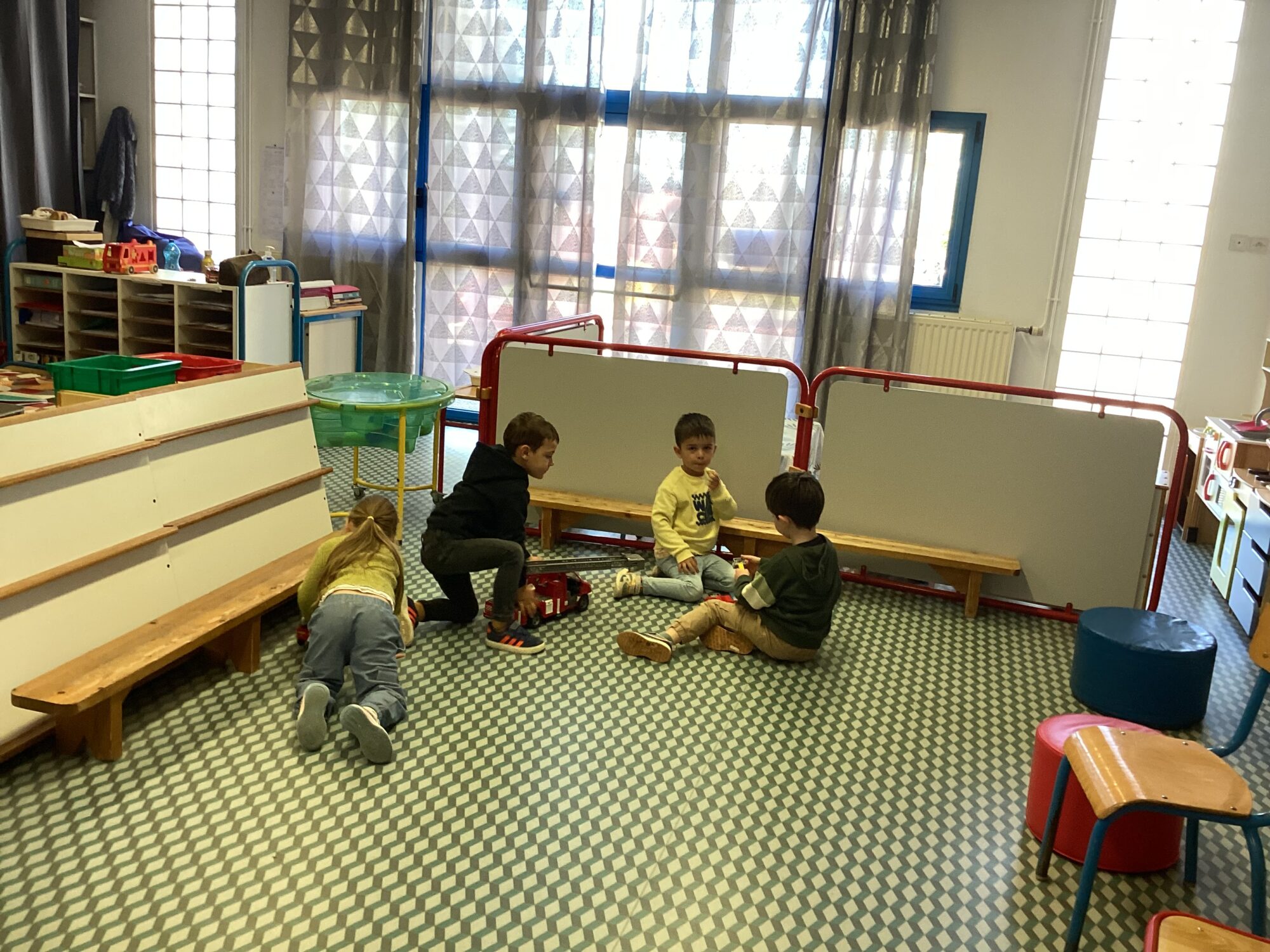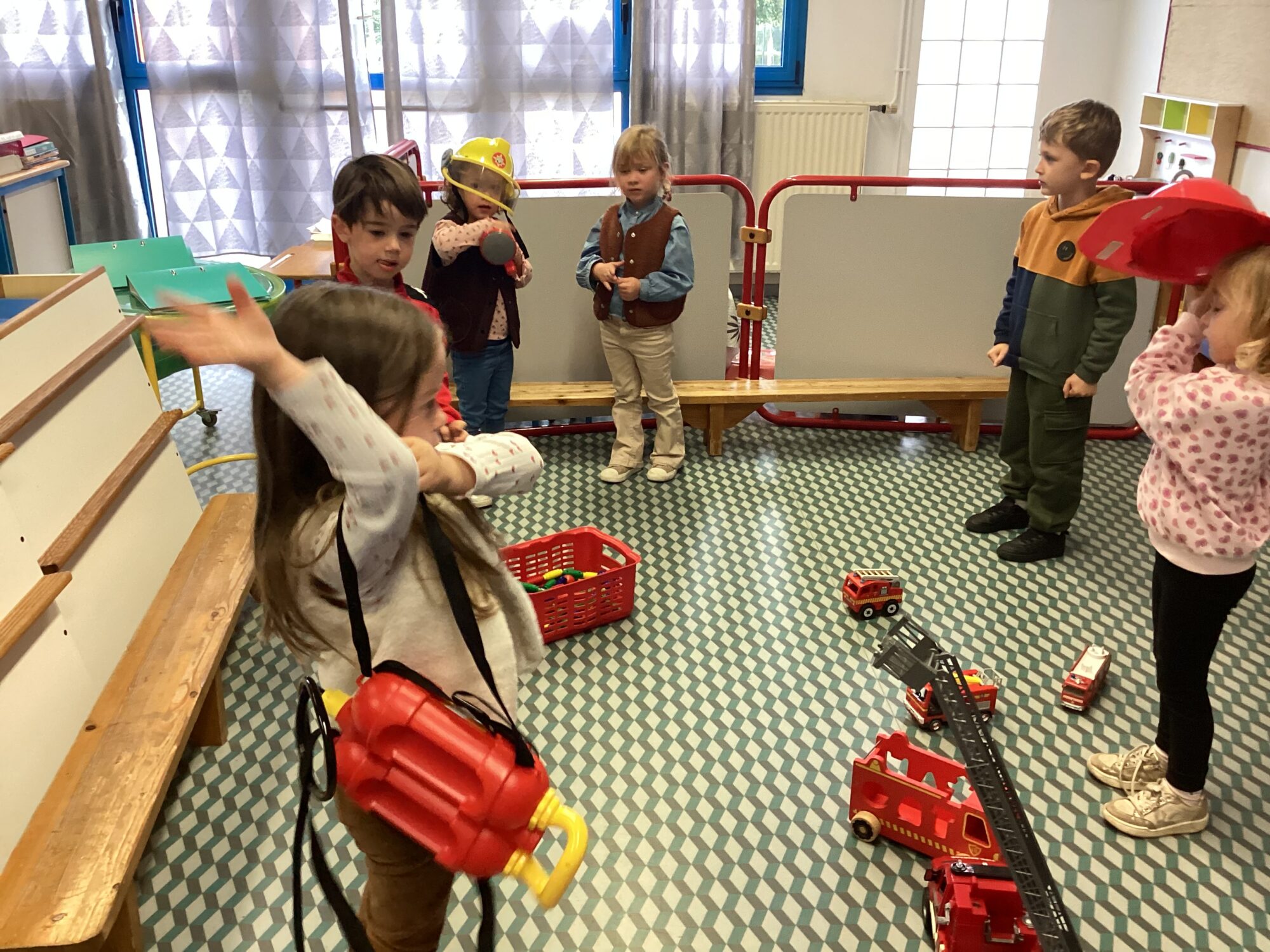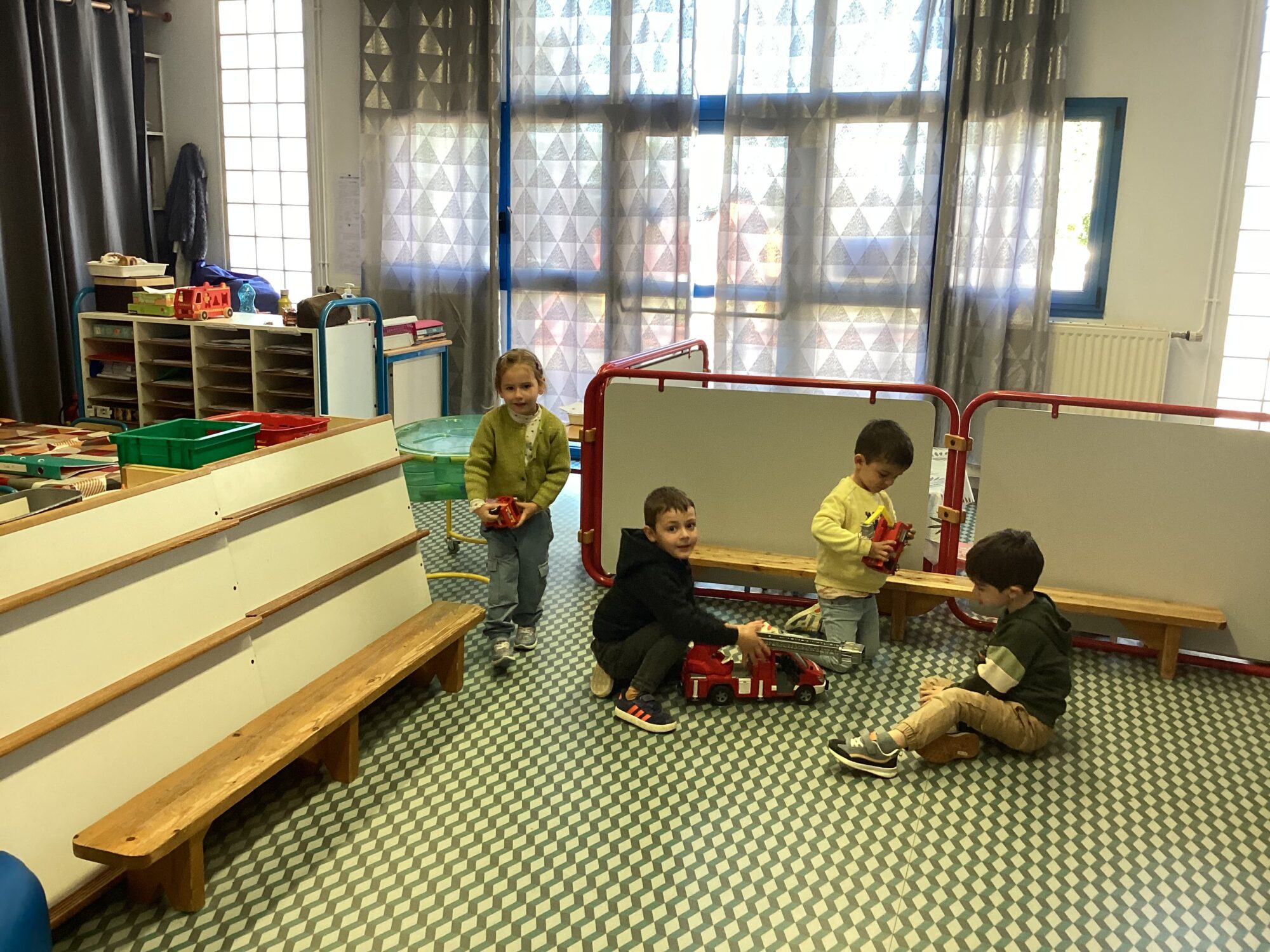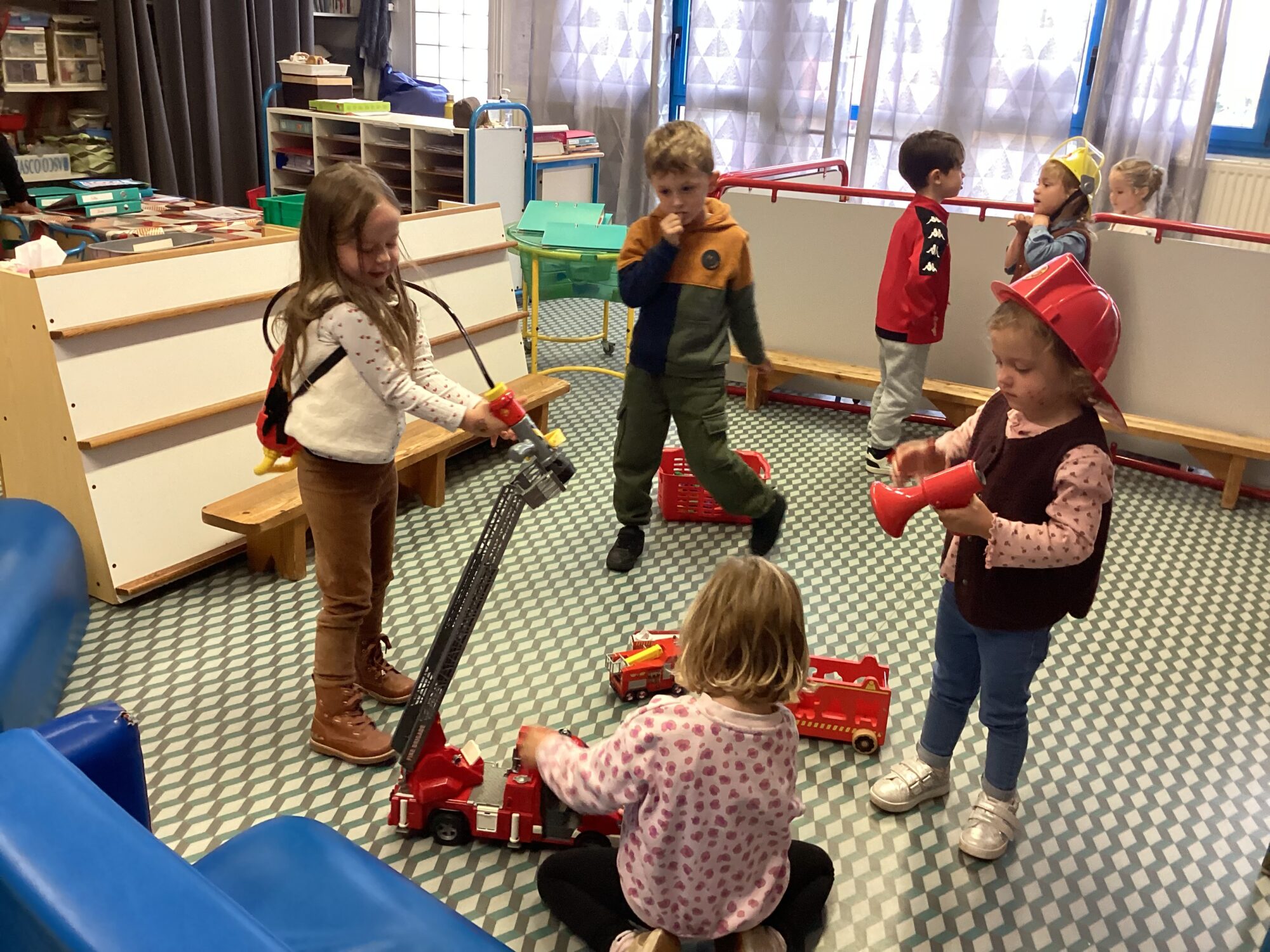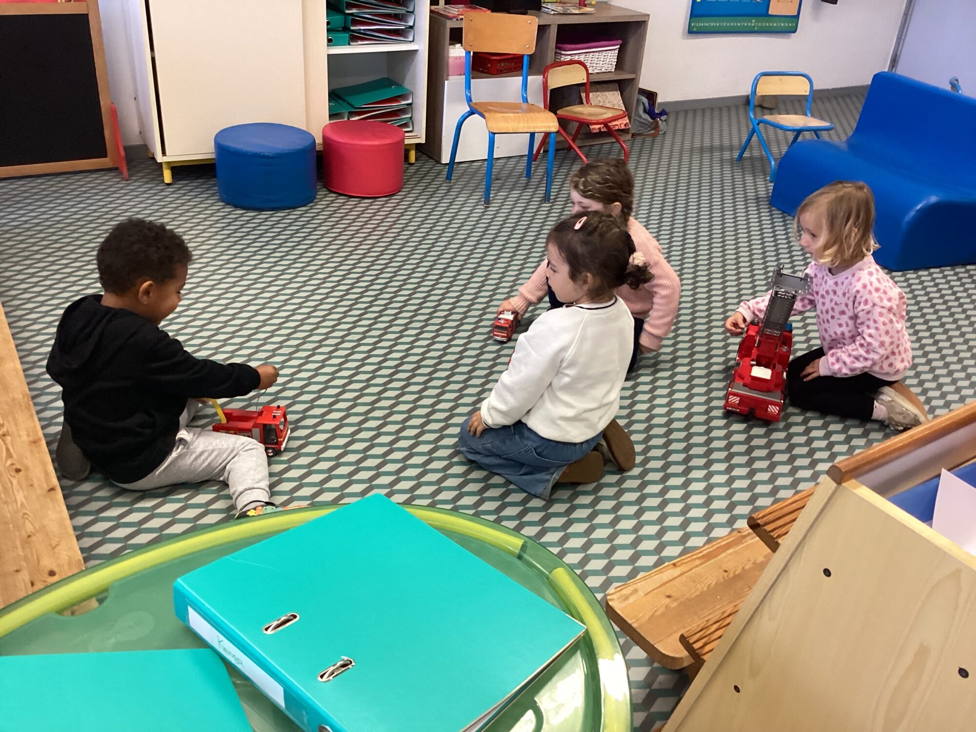 Les enfants apprécient notre coin «  pompiers », après les ateliers par petits groupes les enfants peuvent jouer en autonomie.